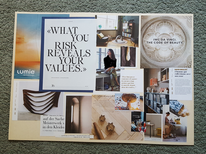 לשבת מול כל זה לבד, ליד שולחן, על שטיח, ולחפש מה מושך אותי. בלי לקבוע מטרה, בלי לשים את האצבע על משהו מסוים, בדיוק להיפך. לגלות איזה תמונה מדברת אלי. אני גוזרת את התמונות שבולטות לי, מוסיפה קצת ניירות שמוצאים חן בעיני, קטעים כתובים, משפטים או מילים שמדברים אלי, שמה מולי על הלוח, קצת מעצבת שישתלב בצורה נעימה לעין שלי, ואז מסתכלת ושואלת מה זה אומר לי, מה אני רואה".