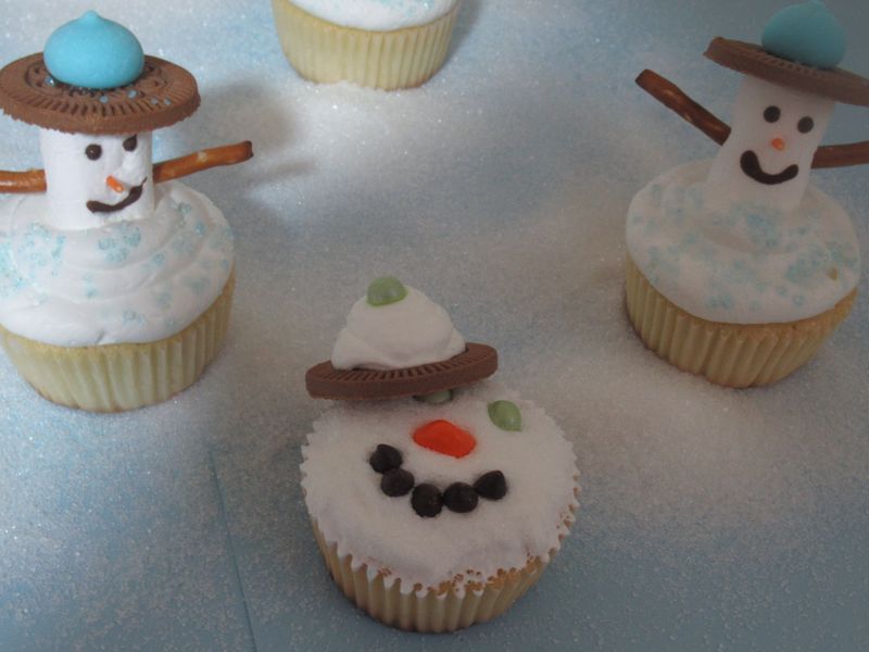 נועצים בובת שלג במרכז כל קאפקייק. נועצים לתוך הקרם, קצת לעומק כדי שייתפס.