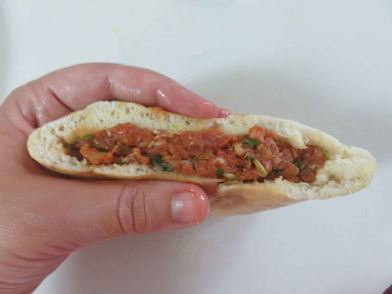3. ממלאים את הפיתה בחופן מתערובת הבשר כך שעובי המילוי יהיה במעט יותר מעובי הפיתה. אין למלא יותר מזה וזאת כדי שהבשר יתבשל די צרכו.