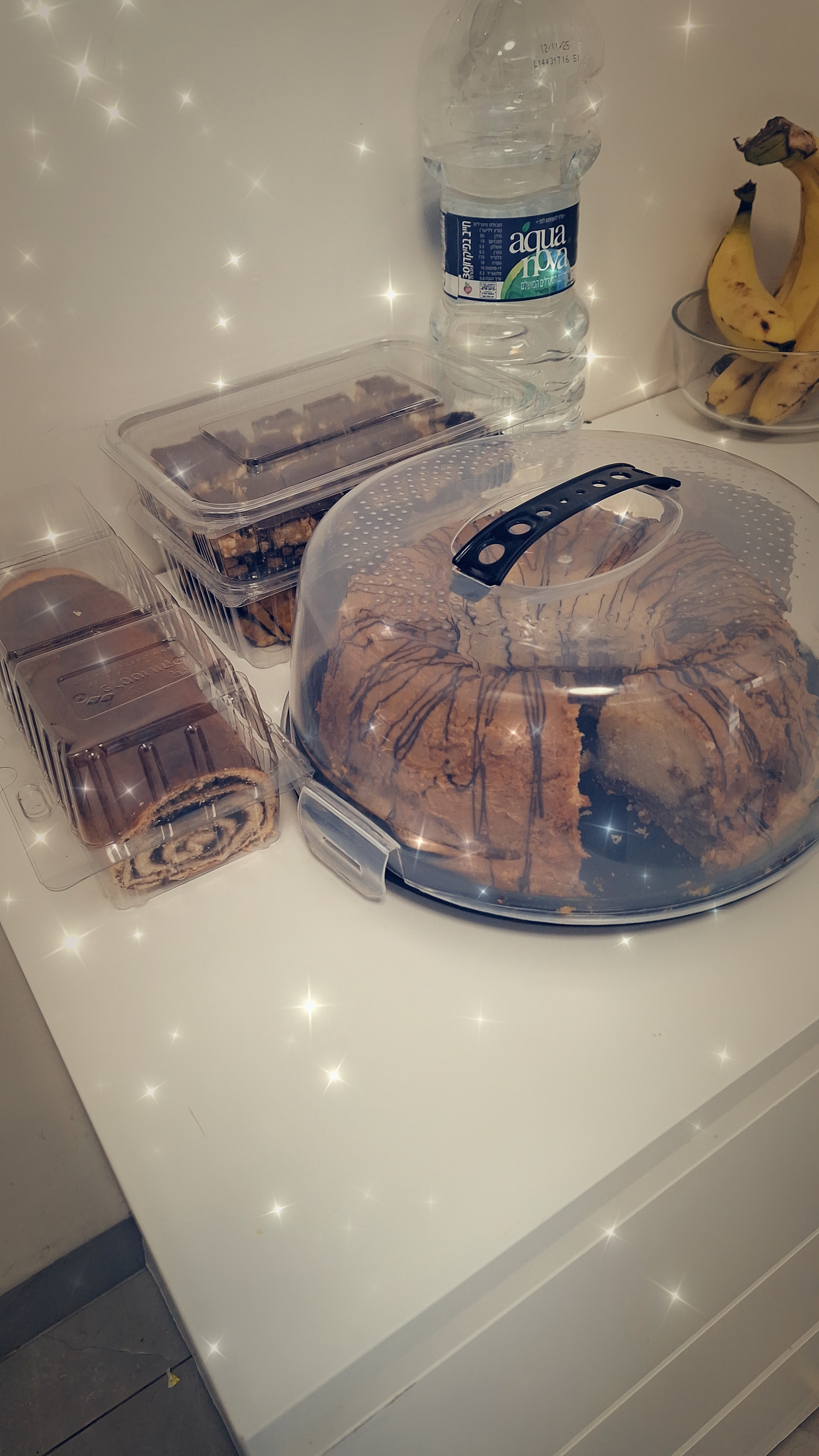 היה עוף עסיסי (בתמונה נראה שרוף), תפו"א בטימין, אורז, קצת ירקות, דגים, 2 עוגות.