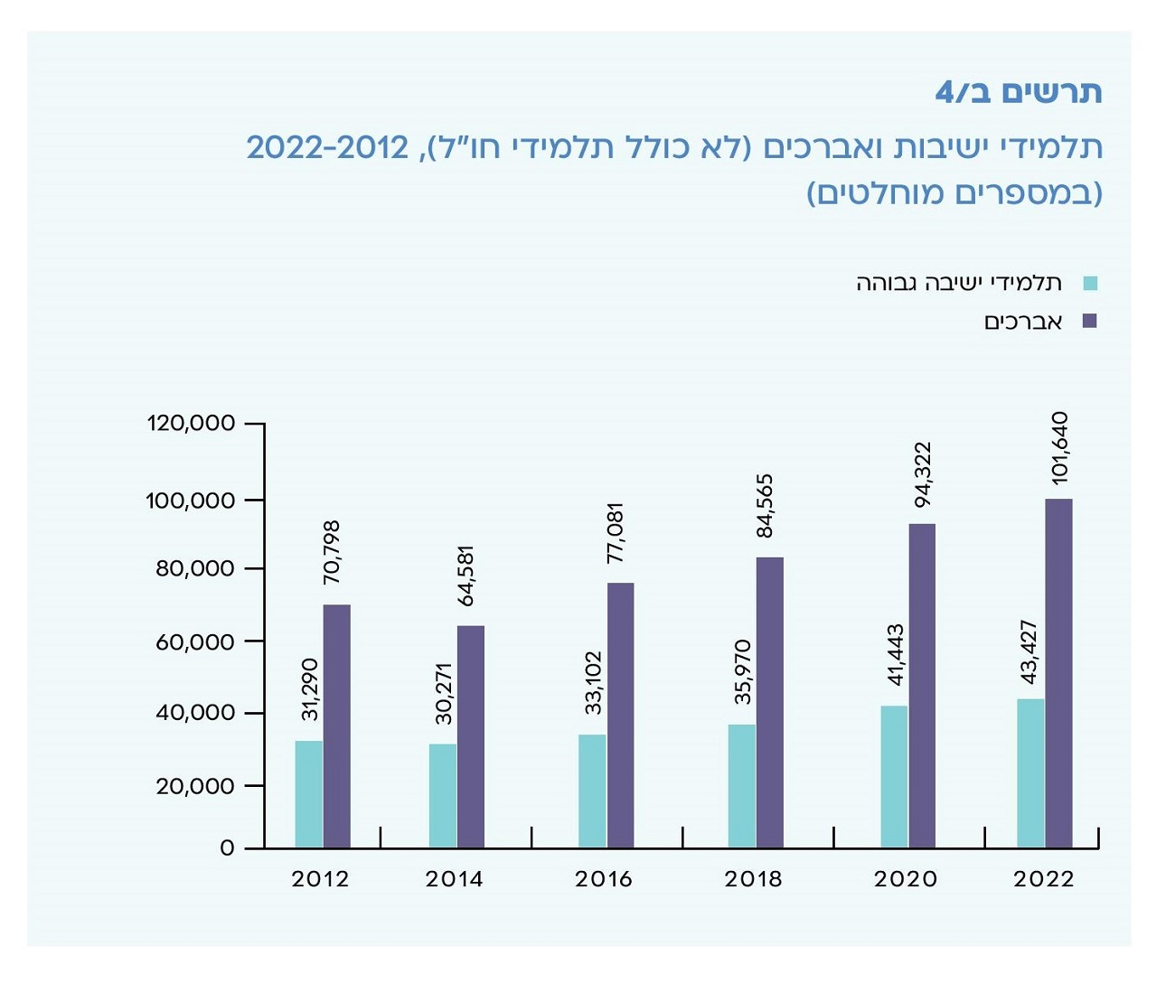 תלמידי הישיבות והאברכים:1 בתחילת 2023 היה מספר תלמידי הישיבות ואברכי ה"כולל" החרדים כ-156,036. אחרי שנה שבה הואט הגידול במספר בחורי הישיבות והאברכים ל-2.5%, בשנת 2022, שבסופה חזרו המפלגות החרדיות לקואליציה, הוא גדל שוב ב-4.1%.