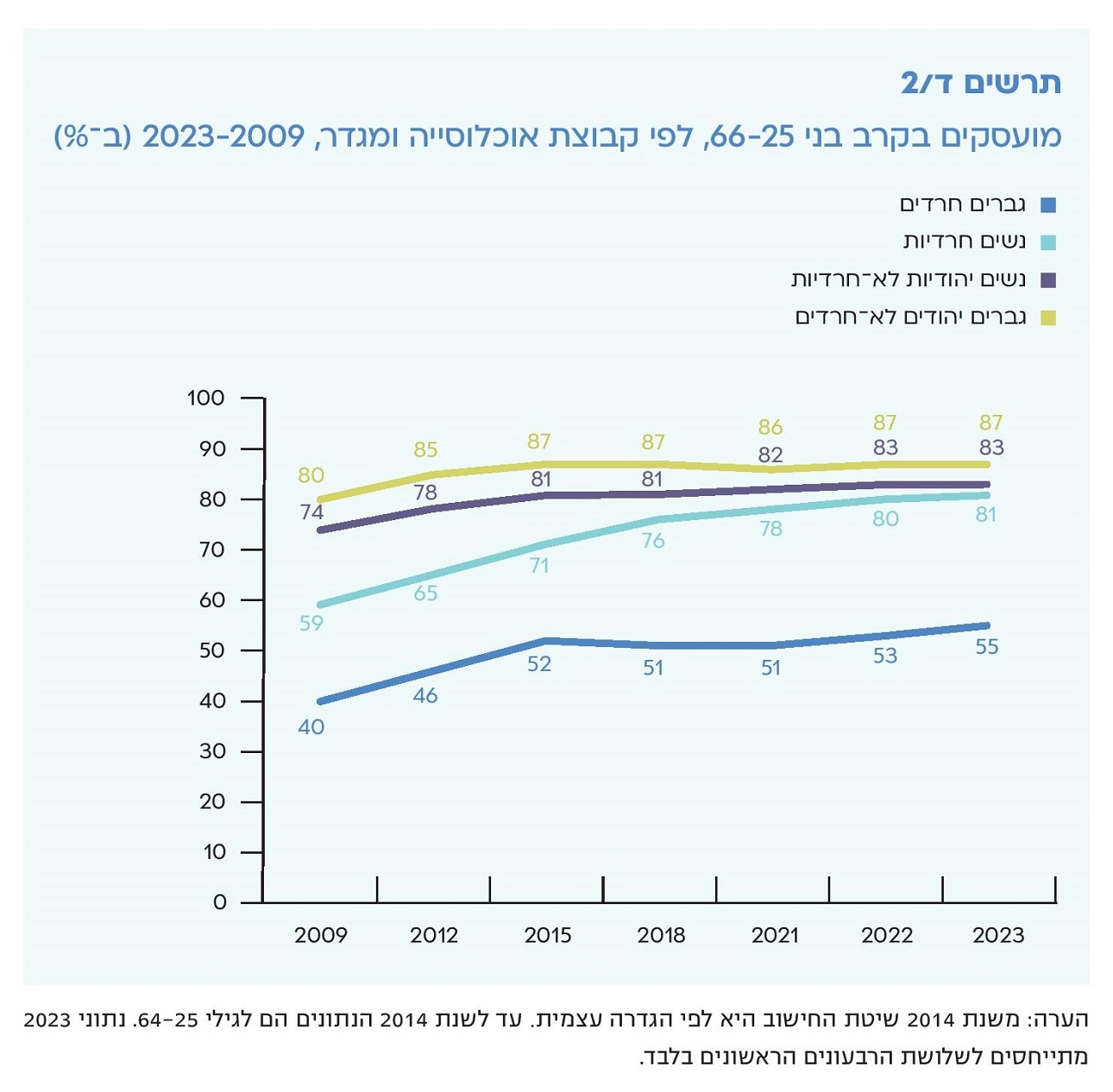 בשנת 2023, מספר הנשים החרדיות העובדות בגילי העבודה העיקריים חצה לראשונה את רף ה-80% וזינק ל-157,000, עלייה מ-142,000 אשתקד. יצוין כי נתוני 2023 נכונים לשלושת הרבעונים הראשונים, וייתכן כי הנתון הסופי לשנת 2023 יהיה נמוך יותר בייחוד בקרב גברים חרדים עקב המצב במשק לצד הכספים הקואליציוניים למוסדות התורניים.
