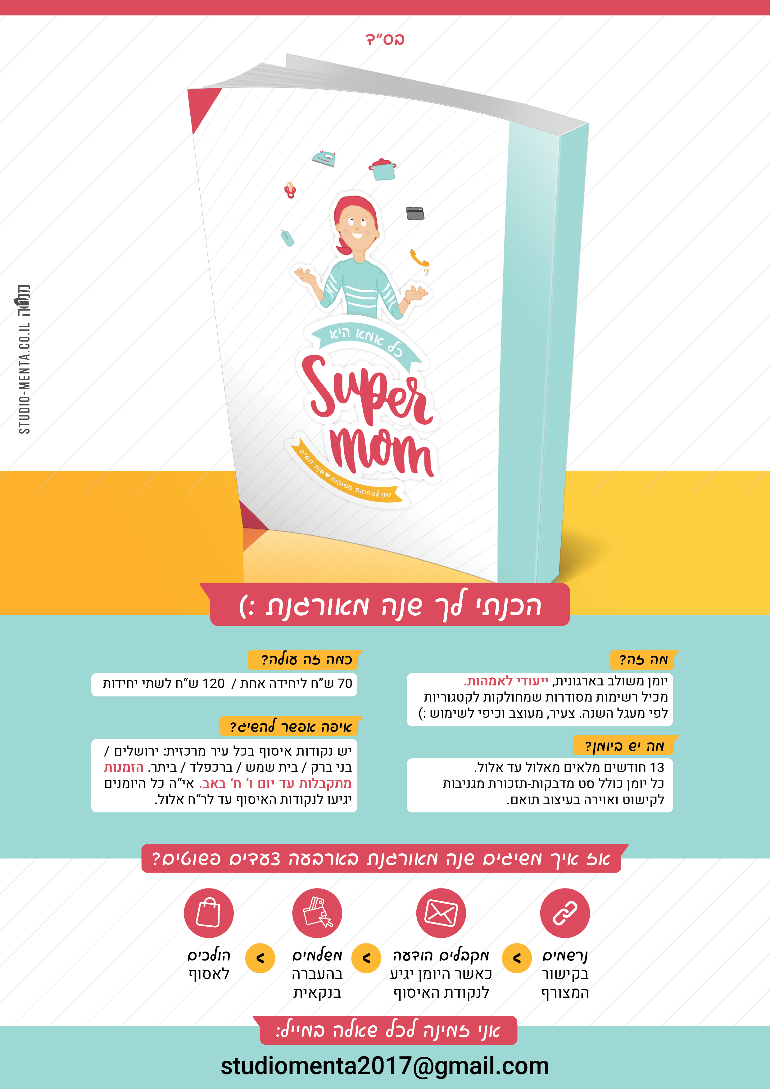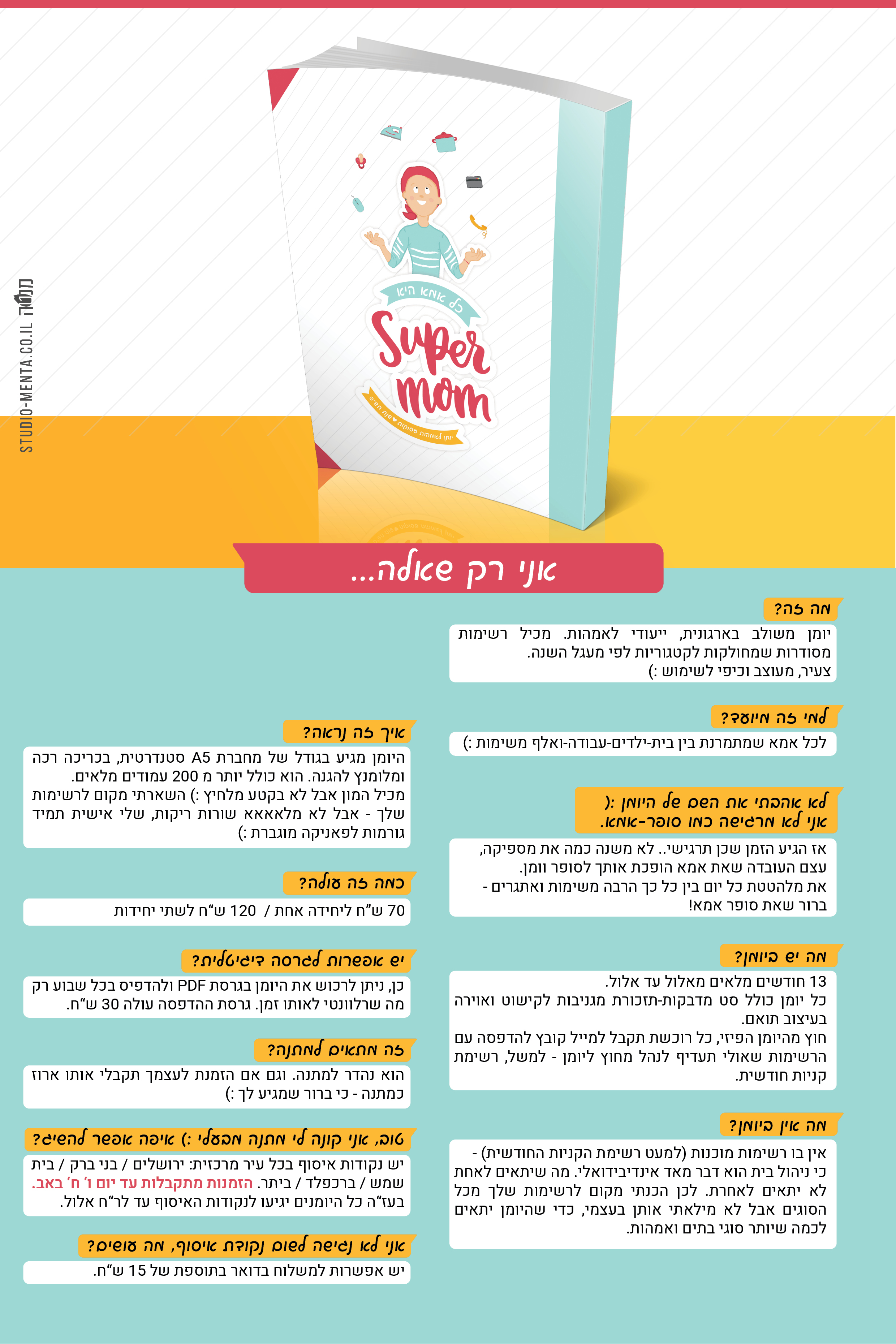 ירדתי מאיור וניסיתי לעצב כריכה שתבטא את שלל הפרוייקטים שכל אישה חולשת עליהם. אז קראתי ליומן SUPER MOM ודחפתי פנימה מלאאאא אייקונים שיבטאו את הסופריות הנ"ל.
