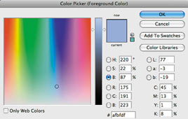בחרו בכלי דוגם הצבע (הטפטפת) ודגמו צבע אופייני באיזור השמים. לחצו על צבע החזית בחלון הכלים, ובחלון בורר הצבעים (Color Picker) שייפתח, הכהו את הצבע על ידי הקטנת הערך בשדה המסומן באות B והגבירו את הרוויה על ידי הגדלת הערך בשדה המסומן באות S.
