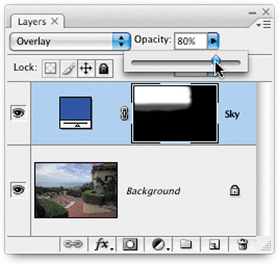 בתום פעולות הציור, יש לבדוק האם חשיפת הצבע הכחול בוצעה באופן אחיד. החזיקו את מקש Alt, והקליקו על דמות המסיכה של השכבה Sky. פעולה תציג את המסיכה בלבד. צבעו בלבן במקומות בהם ישנם פסים אפורים/שחורים בלתי רצויים. צבעו בשחור מקומות בהירים מדי. על מנת להציג חזרה את התמונה הצבעונית, החזיקו את מקש Alt והקליקו שוב על דמות המסיכה. במידת הצורך, הפחיתו את אטימות השכבה, עד לקבלת הצבע הרצוי.