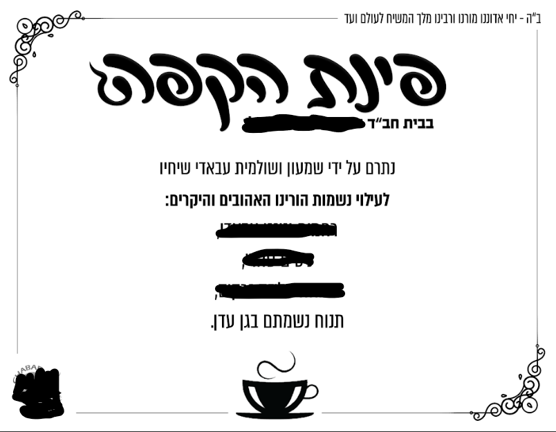 טשטשתי את הפרטים של איפה זה ושל התורם.. בא נראה מי יודע מאיזה הדרכה העתקתי קופי פאסט את הכוס קפה..