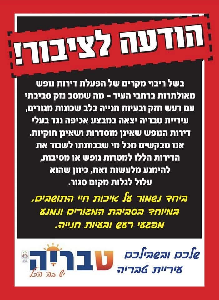 בשל כך, עיריית טבריה פונה לכל המבקשים לשכור דירות נופש בשכונות מגורים - להימנע מלעשות זאת, כיוון שהם עלולים למצוא את דירת הנופש ששכרו ועליה שילמו מבעוד מועד, סגורה לשימוש באמצעות צו שתוציא המחלקה המשפטית של עיריית טבריה.