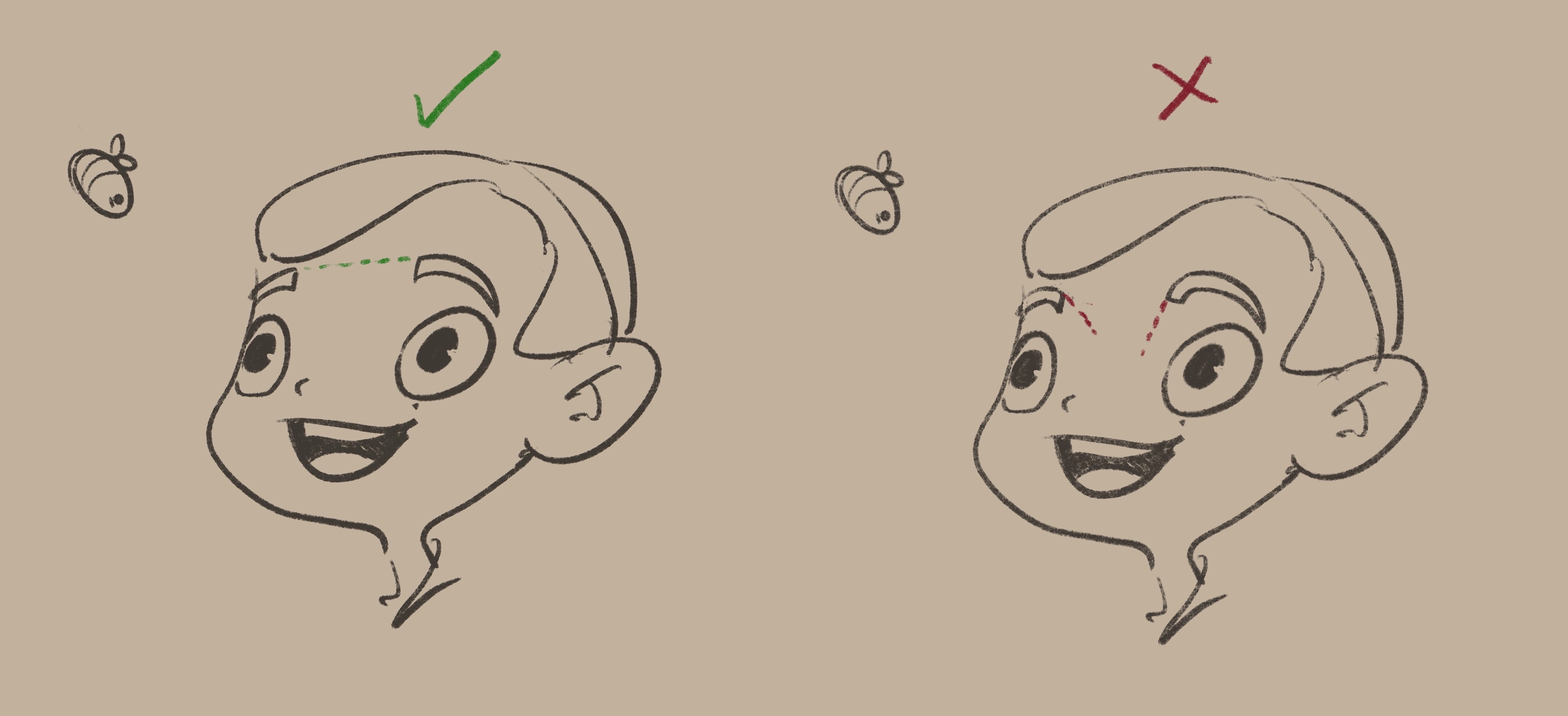 קו אמצע הפנים, מיקום העיניים, האף והפה, והקווים שמתארים את הלסת והלחיים –