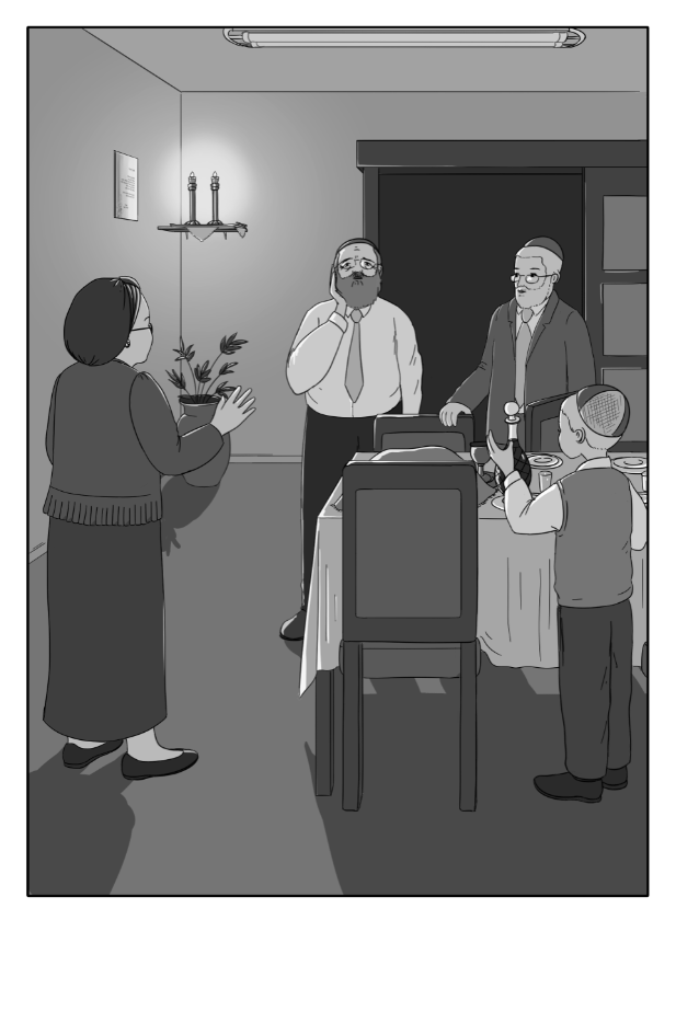 01 - הלקוח: "אנחנו צריכים ציור אילוסטרציה למטה של אחד המועמדים, אני רוצה להמחיש איך שהמתמודד הנ"ל לא מגיע לבד, אלא עם עגלה עמוסה של הישגים, מוסדות תורה וקהילות נוספות שתומכות בו. אז חשבתי אולי להראות את העיר מרחוק, ואת העירייה בצורה בולטת, ואז את המתמודד הנ"ל מגיע עם עגלה עמוסה, עף בשמיים לכיוון העירייה".