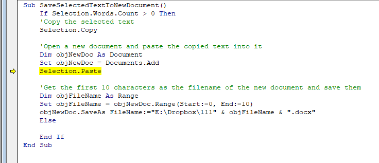 מצאתי כאן מאקרו שמעתיק את הבחירה שלך בוורד ופותח קובץ חדש מדביק ושומר. כשניסיתי אותו הוא נתקע בשורה של ה'הדבק', משהו יכול להבין מה הסיבה?