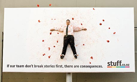 אתר החדשות הניו זילנדי Stuff מיצב את עצמו כמי שמביא כותרות מהר יותר ממתחריו. כדי להמחיש נקודה זו, יזם האתר מהלך פרובוקטיבי: אחד מכתביו - שכביכול פספס סיפור טוב - הועלה לשלט חוצות בצד אחד הכבישים במדינה, ונרגם ב־150 ק"ג של עגבניות לעיני הנהגים שהיו בדרכם לעבודה.
