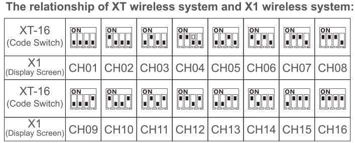 בשביל להשתמש ב-16 קבוצות צריך להוסיף מקלט USB חיצוני (XT16 או XTR16). קביעת הערוץ מתבצעת בהזזה לא דיגיטלית. בשביל להתאים את זה לערוץ דיגיטלי צריך את הטבלה המצורפת :