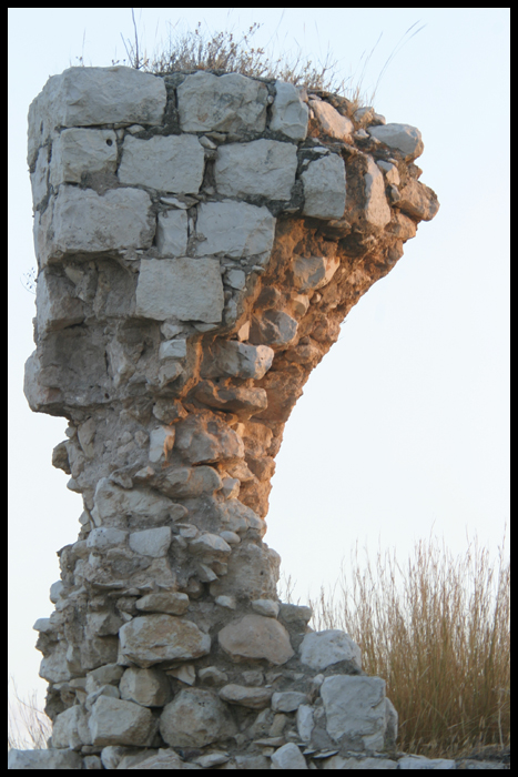 תאורה קשה - קרני השמש הישירות אשר האירו על קיר הבניין יצרו צללים חדים המדגישים את מרקם האבנים.