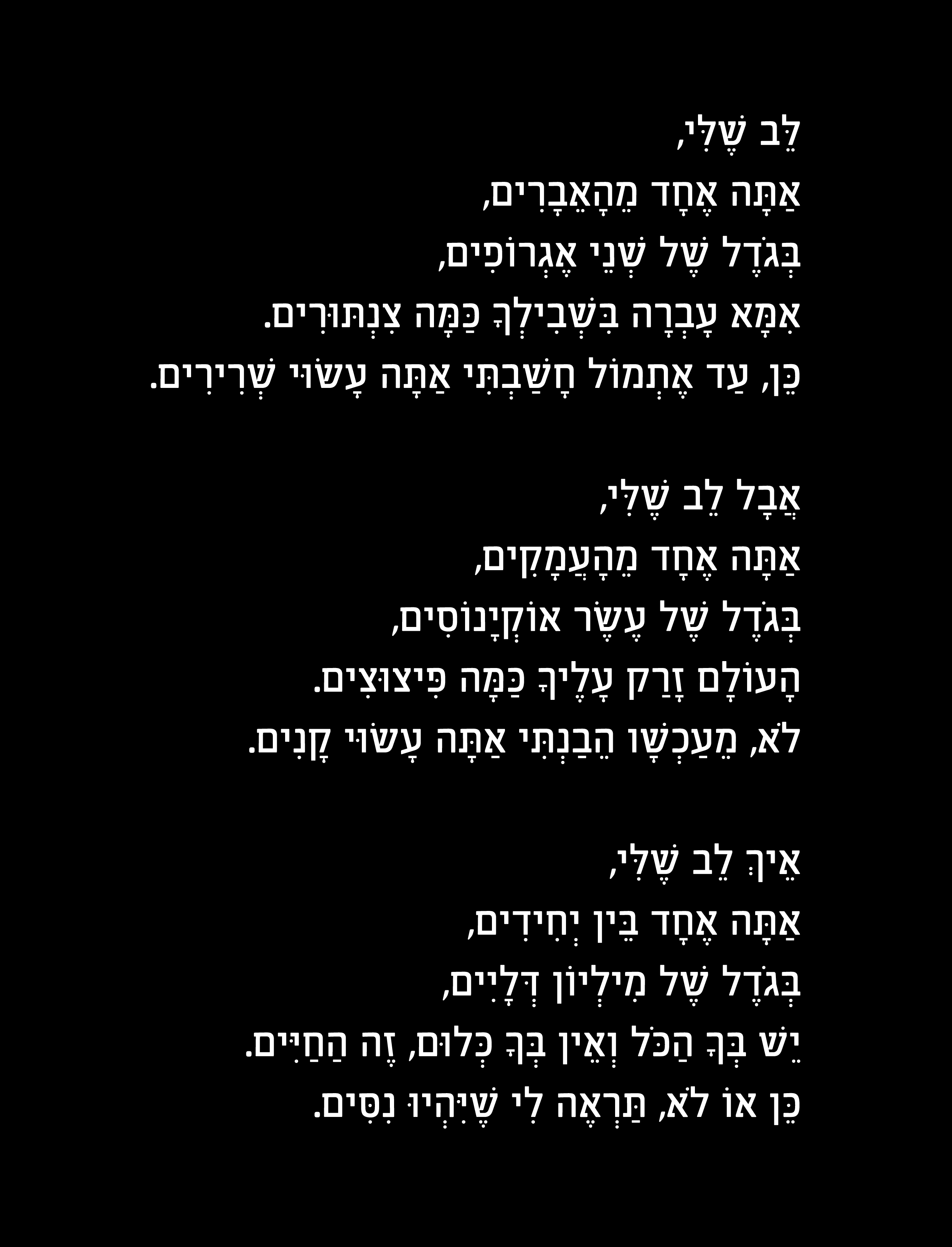 "לא חייב להיות "מי" דווקא". אמר הרב. "המציאות הזו, המהות הזו, יש לה ישות משל עצמה. היא מספיק כבדה. ואם היא נופלת עלינו, היא מכאיבה".