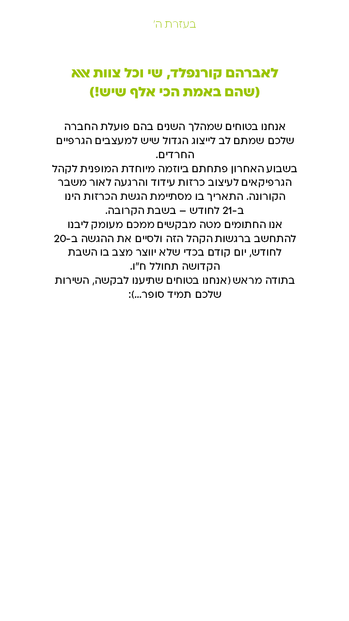 מצטרפת שזה יכול להיות במוצ"ש בכללבהמשך למה שדובר פה באשכול, מעלה מכבת שניסחתי שיישלח אי"ה לאאא (הערות, הארות וכו' - בשמחה!)