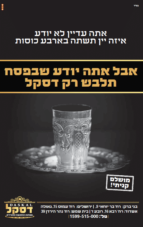כי כנראה הם יודעים שלא צריך לשכנע את הלקוחות שדסקל זה יותר טוב מכל האחרים, כי זה מותג שקיים כבר עשרות שנים, ומוכרים אצל הציבור החסידי כהאופציה הראשונה לקנות