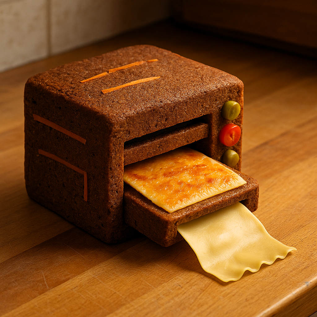 כריך עם גבינה שנראה כמו ספר או שעון עשוי מגבינה, בצק וגזר