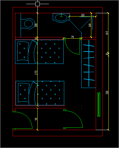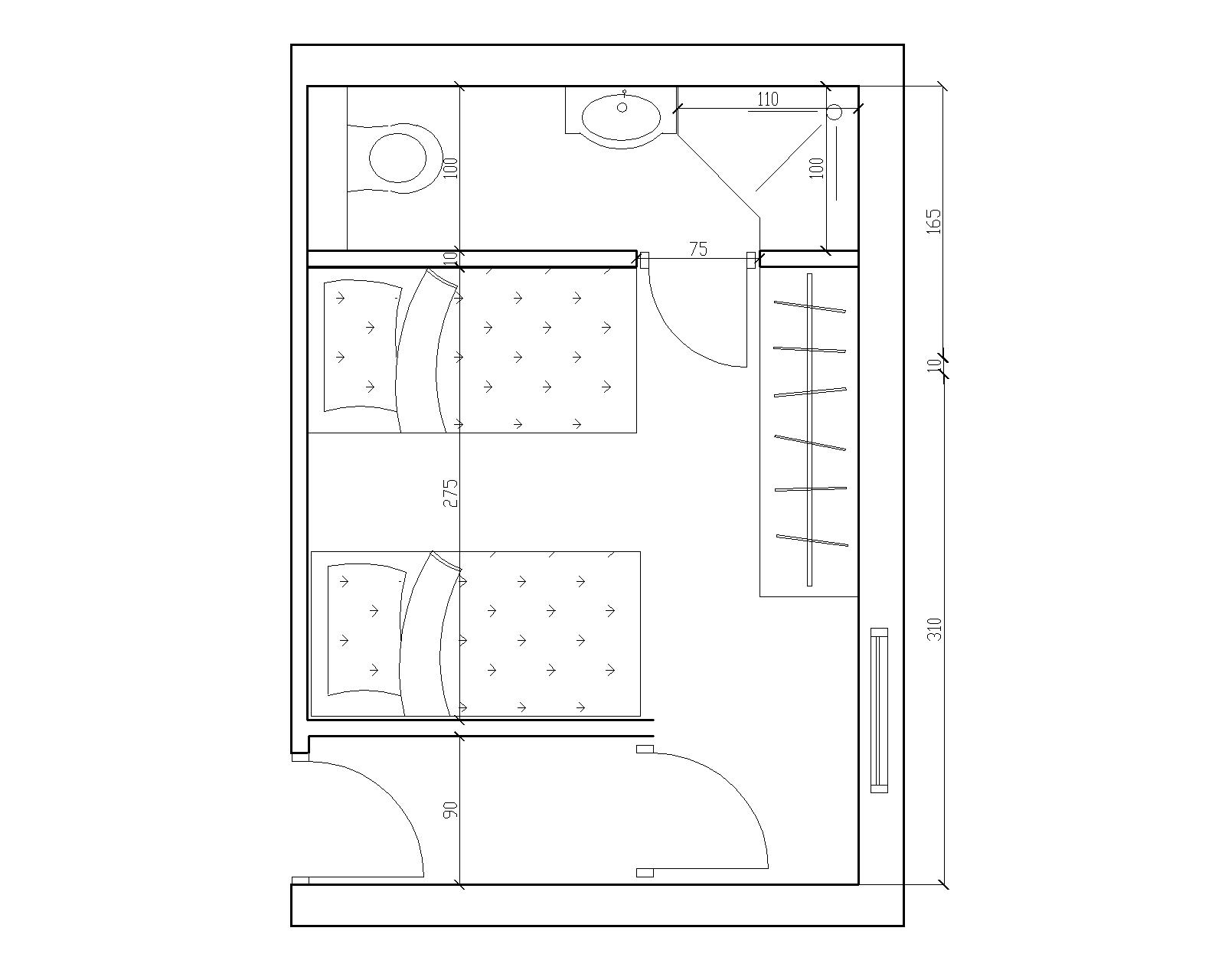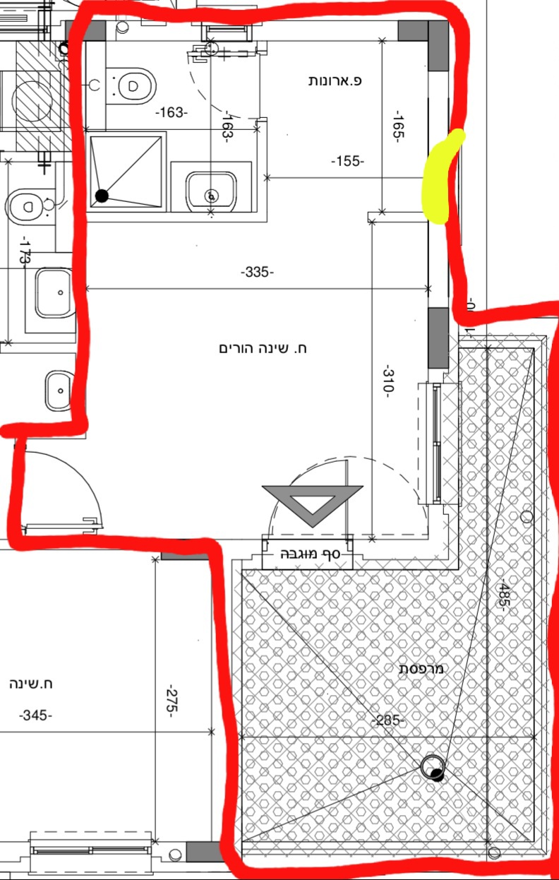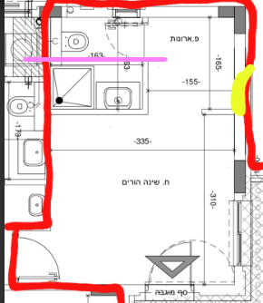אם התכנית נשארת ככה, את חדר האמבטיה ממש כדאי להפוך במראה על הציר הורוד- סגול, את הדלת לשים על הקיר של החדר, ולהרוויח עוד ארון צר. ארון 165 זה ממש מעט לחדר שינה.
