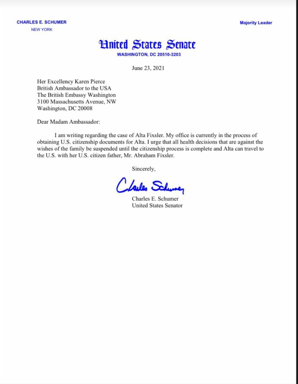 דב אייכלר: שיעור באזרחות לישראל: מנהיג הרוב הדמוקרטי בסנאט, צ׳אק שומר, בפנייה דחופה למערת הבריאות הבריטית שלא לבצע שום הליך רפואי בילדה החרדית (ישראלית!) אלטע פיקסלר, בניגוד לרצון המשפחה, עד לסיום תהליך האזרוח שלה -כבת לאזרח אמריקני- והטסתה לארצות הברית