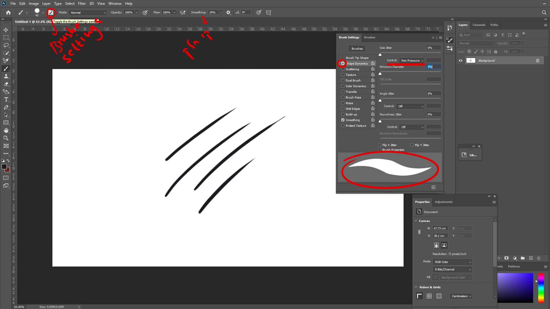 אם אין לך מברשת כזו- הרעיון בקו הזה שהוא קו עט דינאמי לכן בהגדרות של המברשת (Brush Settings) צריך:
