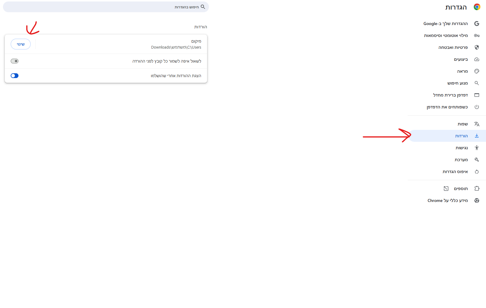 כנ''ל. יש שם עוד אופציה: לשאול איפה לשמור כל קובץ לפני ההורדה. ואז נפתח סייר הקבצים ואפשר לקבוע לו היכן לשמור.