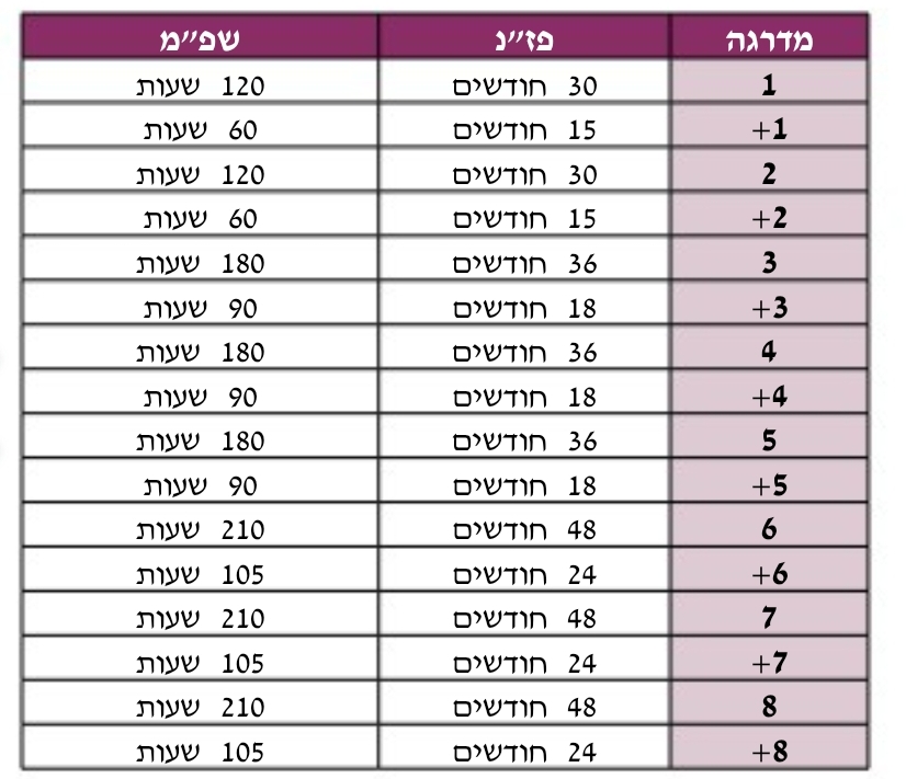 קידום בדרגה משתנה בין הדרגות גם מבחינת שפ"מ (שעות פיתוח מקצועי) וגם מבחינת פז"נ (פרק זמן נדרש).