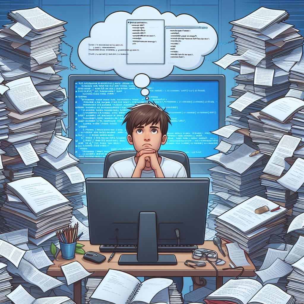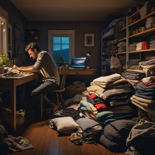 night time. A guy tries to work in front of the computer, behind him piles of dirty laundry, folded blankets and beautiful dishes.​