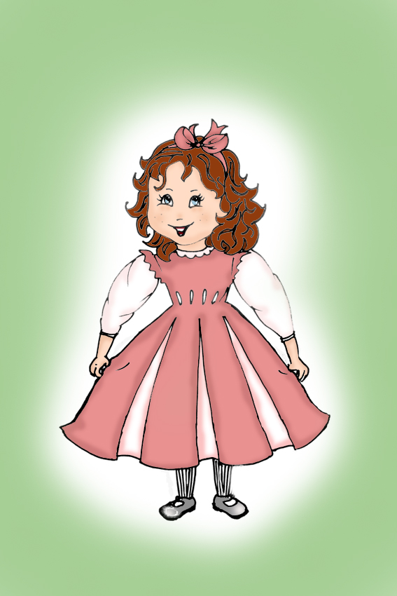 (לקח לי קצת זמן עד שדיברתי עם הציירת) מה שהציור רוצה להביע זה ילדה קטנה המראה בשמחה את שמלתה החדשה. דוגמת השמלה היא מותן גבוה והיא תפוחה וארוכה עד הקרסוליים כמעט. הציירת הסבירה לי שאת הראש היא הגדילה מעבר לפרופורציה בשביל ה"חמידות" (לא מצאתי תחליף למילה שהיא השתמשה...)