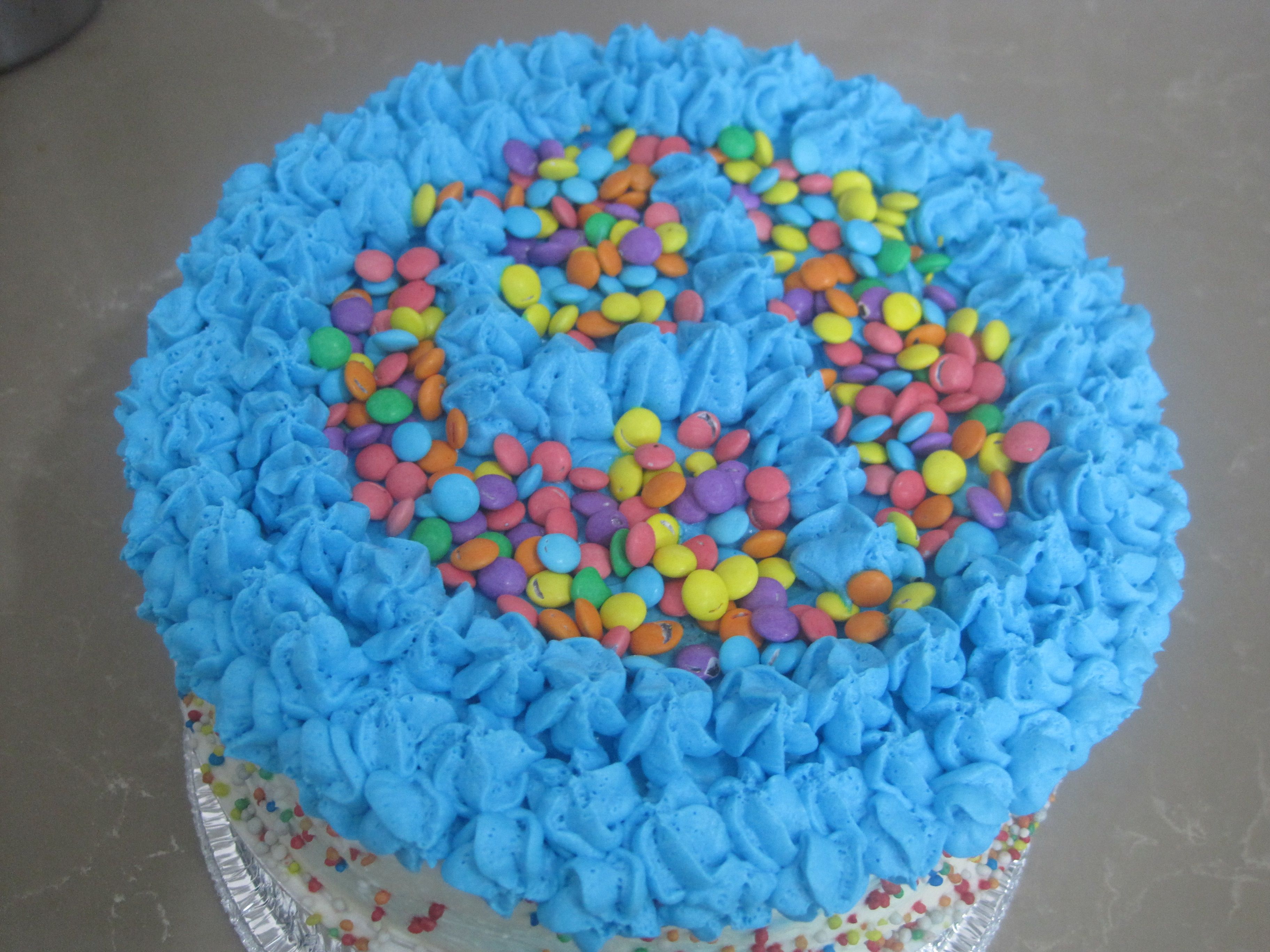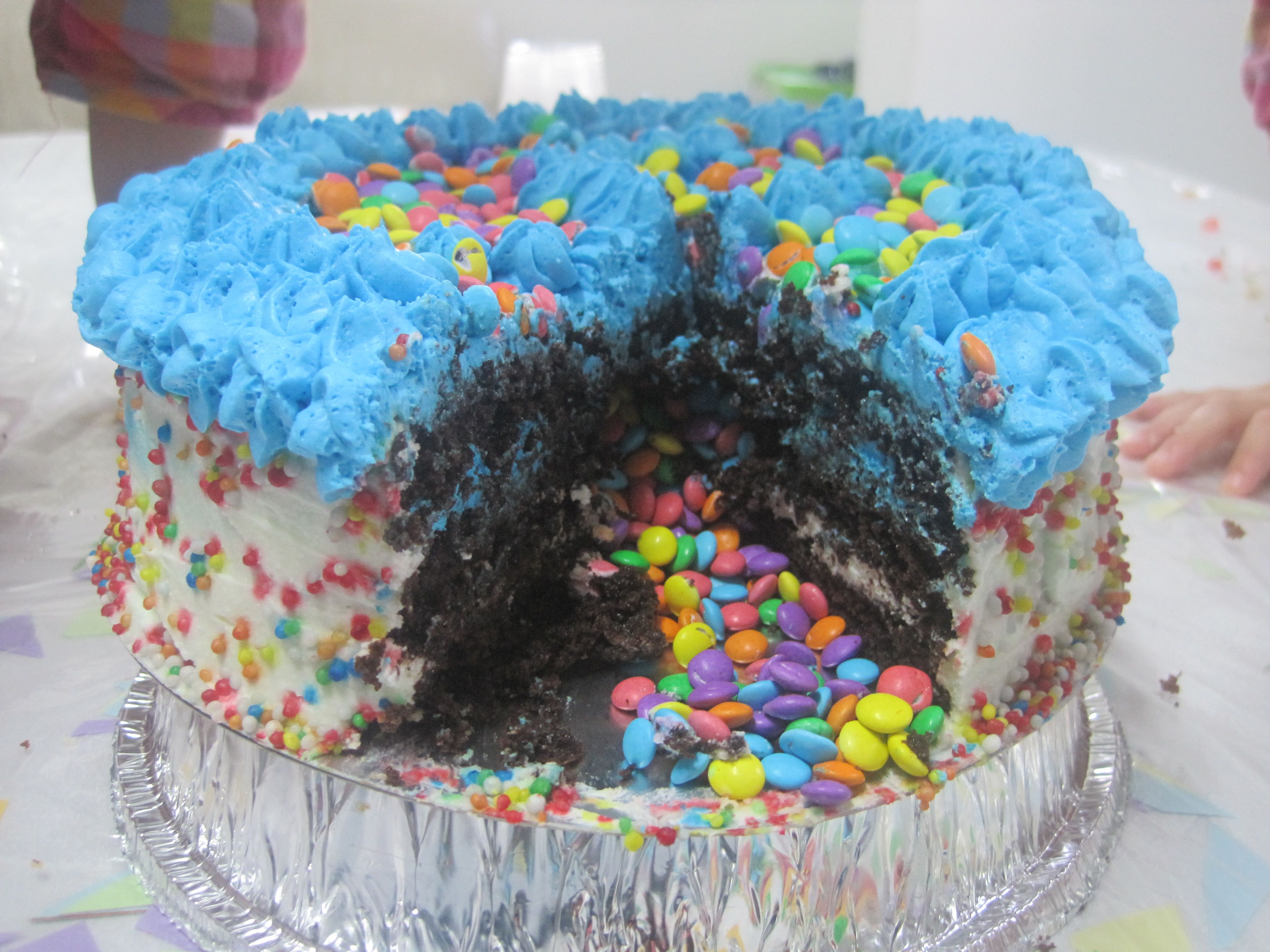לאחר ששמתי את העוגה עם החור על העוגה השלמה התחתונה שמתי עדשים(ובמקרה שלך סוכריות ושלל טופים רק לדעתי בלי העטחפות..)