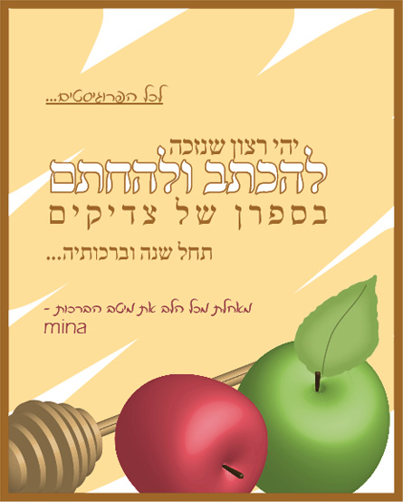 בלי עיצוב זה נקרא??? שנה טובה, שמחה ומאושרת, שתהיה טובה מקודמתה ומיוחדת. שכל דבר יבוא לכם בקלות -כל חלום, משאלה ותקווה - תתמלא במהירות ויעילות. ... שילת..