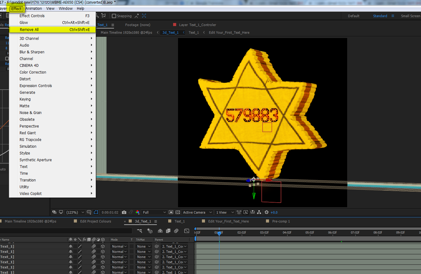 איך אני מוחקת אפקט מסוים משכבת טקסט על הרבה שכבות בו זמנית-באפטר