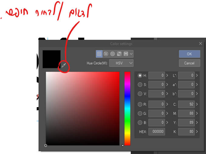 נפתחת חלונית צבעים, אפשר לדגום מצבע המילוי, מקוים אחרים שכבר צבענו, או להמציא צבע שרוצים