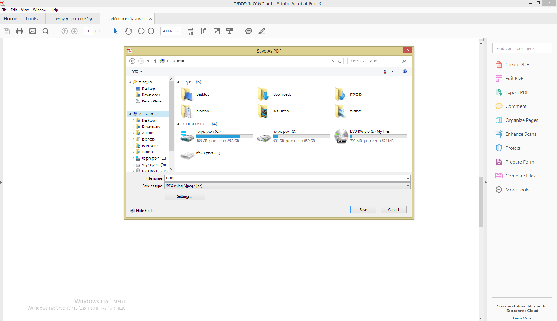 4.נפתח לך חלון למטה ב save as tipe בחץ שבצד ימין תשני מקובץ פי די אף לקובץ jpg