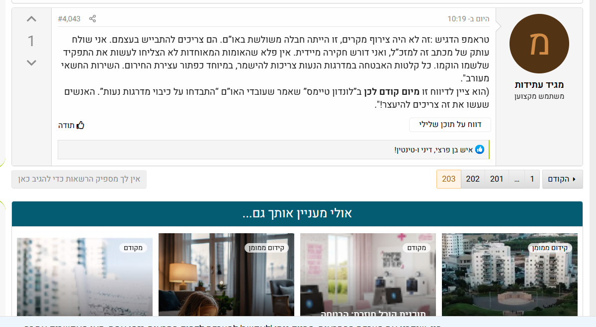 עם זאת, ברגע שאשכול כולל שמות של אדם מסוים, חברה מסוימת, קבצים, מודעות, הקלטות, ראיונות או כל חומר ישיר שמכוון נגד גורם מזוהה, אנו כאתר רשמי לא יכולים לאפשר זאת. מדובר בתוכן שמעמיד אותנו בטרחה יתרה, גוזל זמן יקר, ואולי אף סיכון משפטי. אנו מקבלים על בסיס יומי פניות, התראות ואיומי תביעה על כל אזכור כזה. אין לנו את היכולת לטפל בעשרות דיווחים מדי יום, ולא נחזור לתקופה שבה הנהלת האתר עסקה בהתמודדות מתישה מול עורכי דין ודרישות להסרה.
