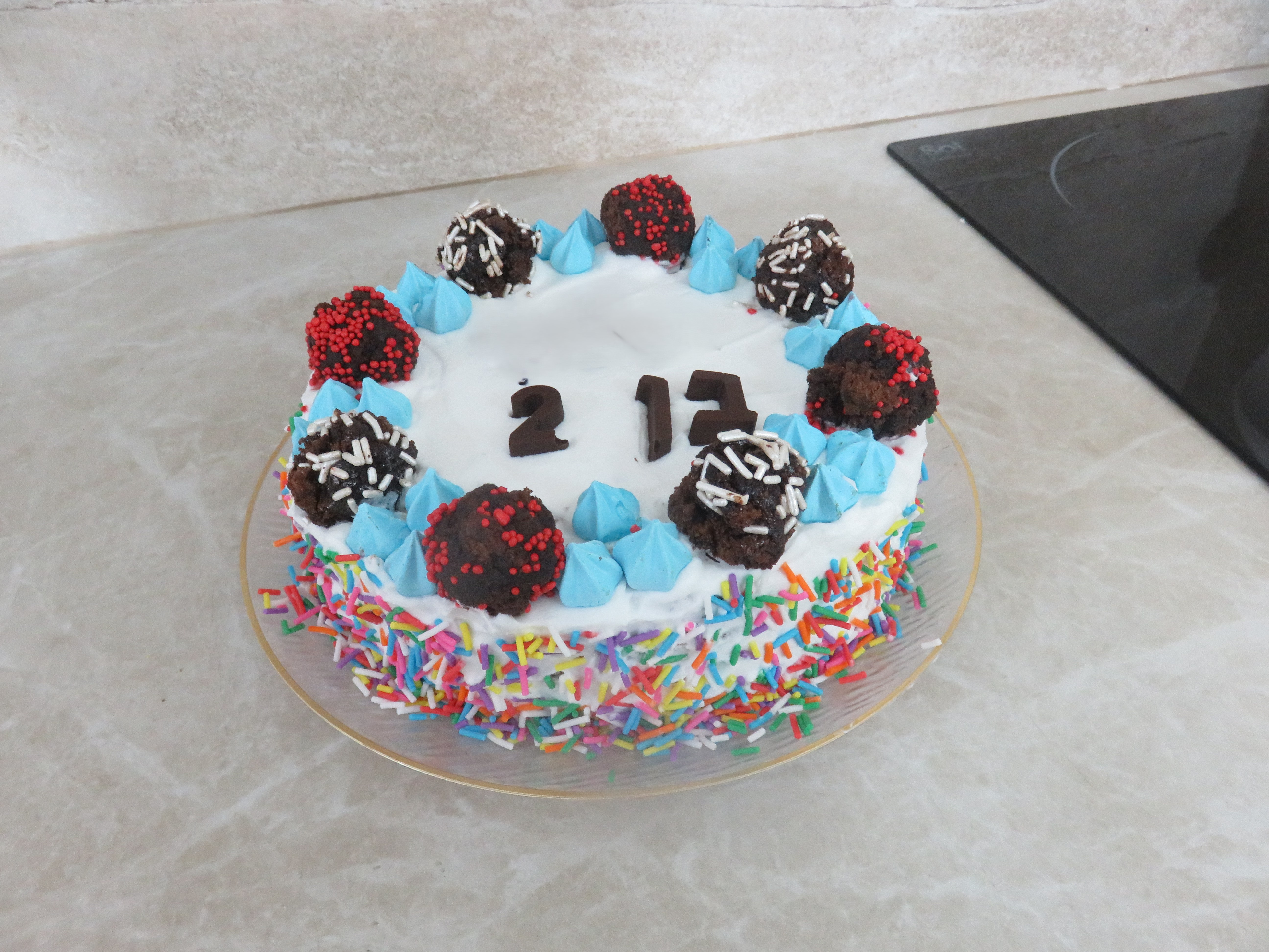 גם אם מריחת הציפוי לא אסטתית באופן מושלם "חיפיתי" עליה בסוכריות צבעוניות. מ"כיפת" העוגה העליונה הכנתי כדורי שוקולד קלילים. והרי עוגת יומולדת שמביאה הרבה שמחה וחדווה לילדים...