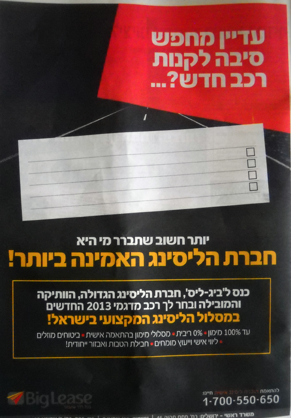 חציית גבול בעולם הפרסום החרדי: משרד הפרסום "בראשית" פרסם מודעת תשובה מועתקת עבור ביג ליס, על טיזרים מהקמפיין שהוכן עבור "רוזנטל רכבים". השקעת עתק עומדת לפני טמיון. ביה"ד של הרה"ג לווין שעבר על המודעות המועתקות, הוציא צו מניעה דחוף האוסר על כל העיתונים לפרסם מודעות אלו בכל מקום שהוא. שוק הפרסום החרדי עומד בפני טלטלה לא פשוטה בעקבות המעשה הנפשע שאין לו תקדים או אח ורע בשוק הפרסום הכללי בכלל ובשוק החרדי בפרט.