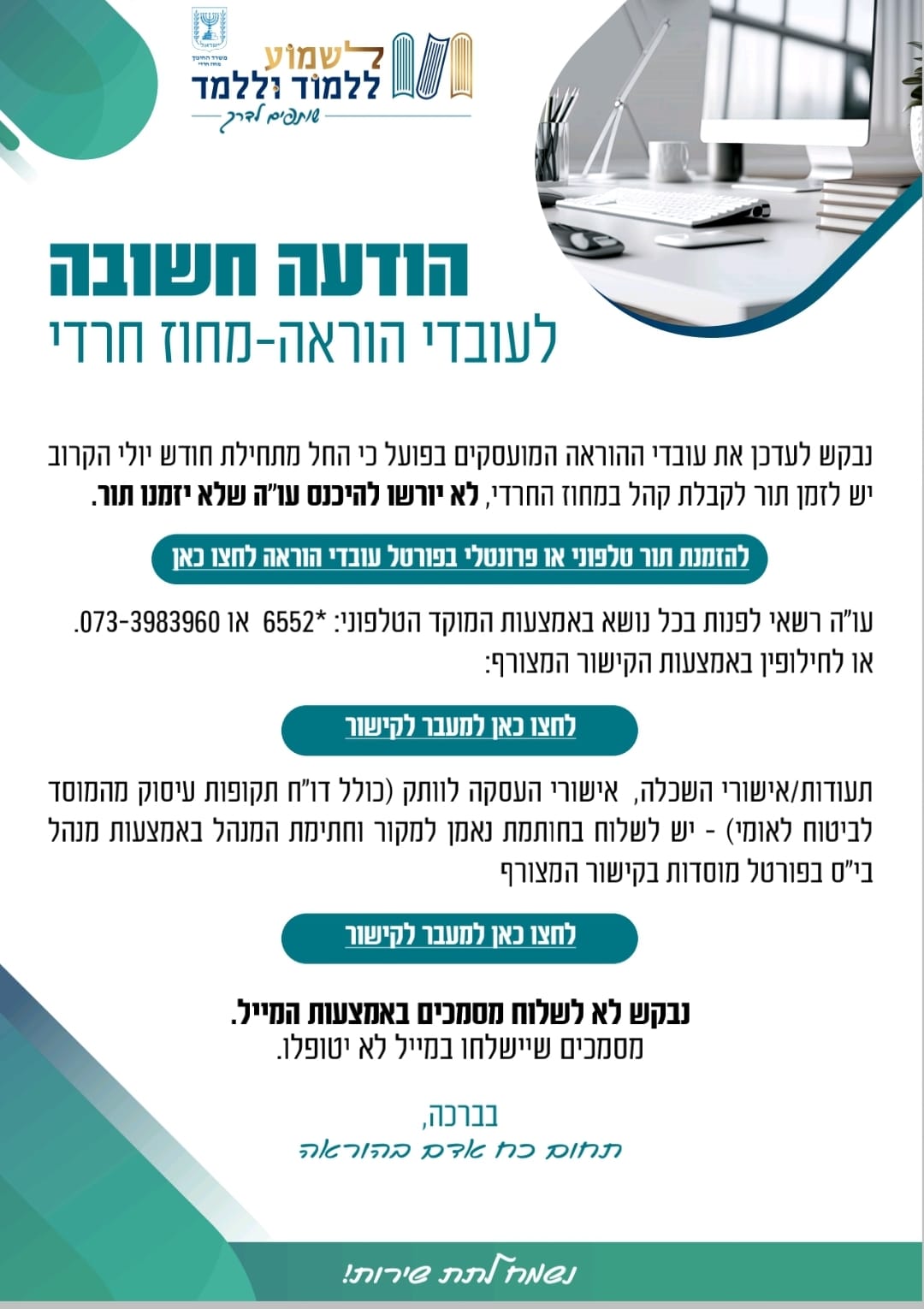 • הואיל ולא ניתן כיום להגיע פיזית למשרדי המחוז, יש להעביר את המסמכים לאחר סריקתם באמצעות הדוא"ל של מנהל בית הספר במערכת פורטל מוסדות חינוך. על התעודות יציין מנהל בית הספר "נאמן למקור" בצירוף חתימתו.