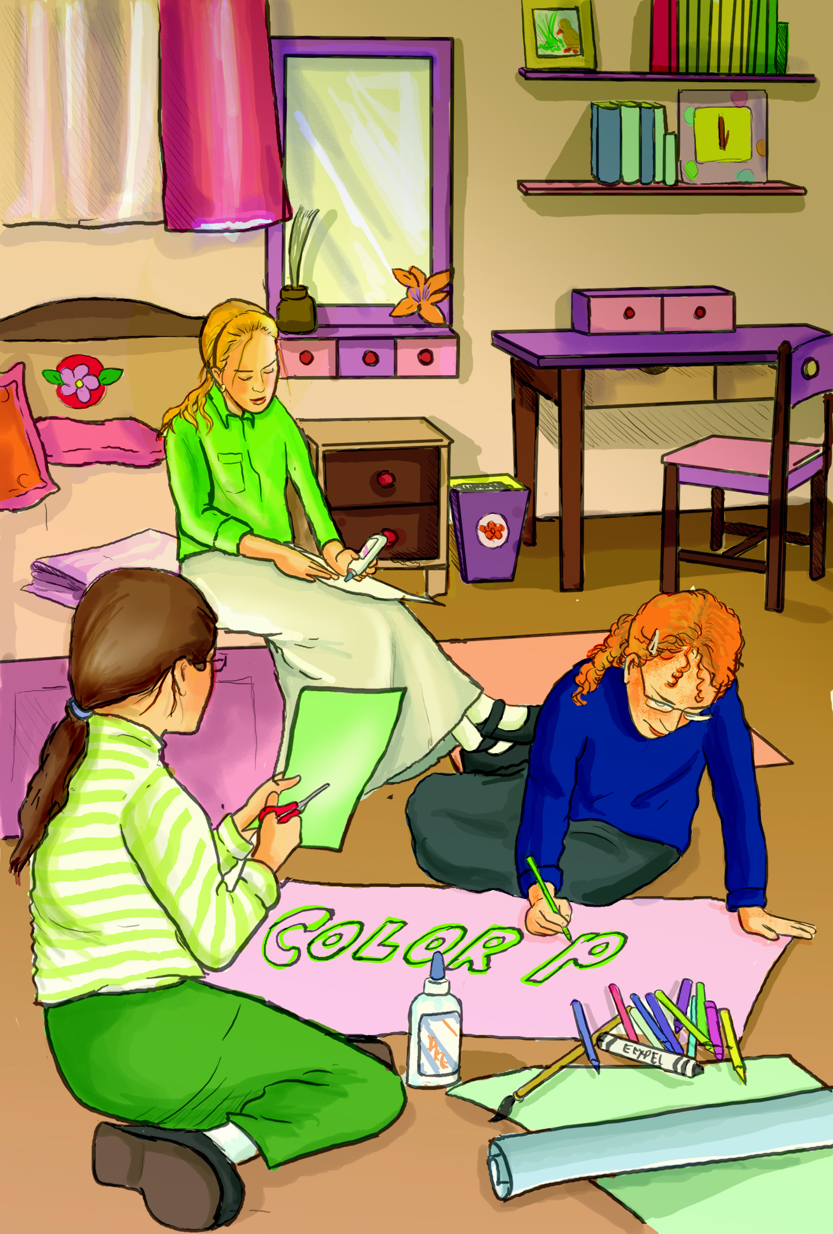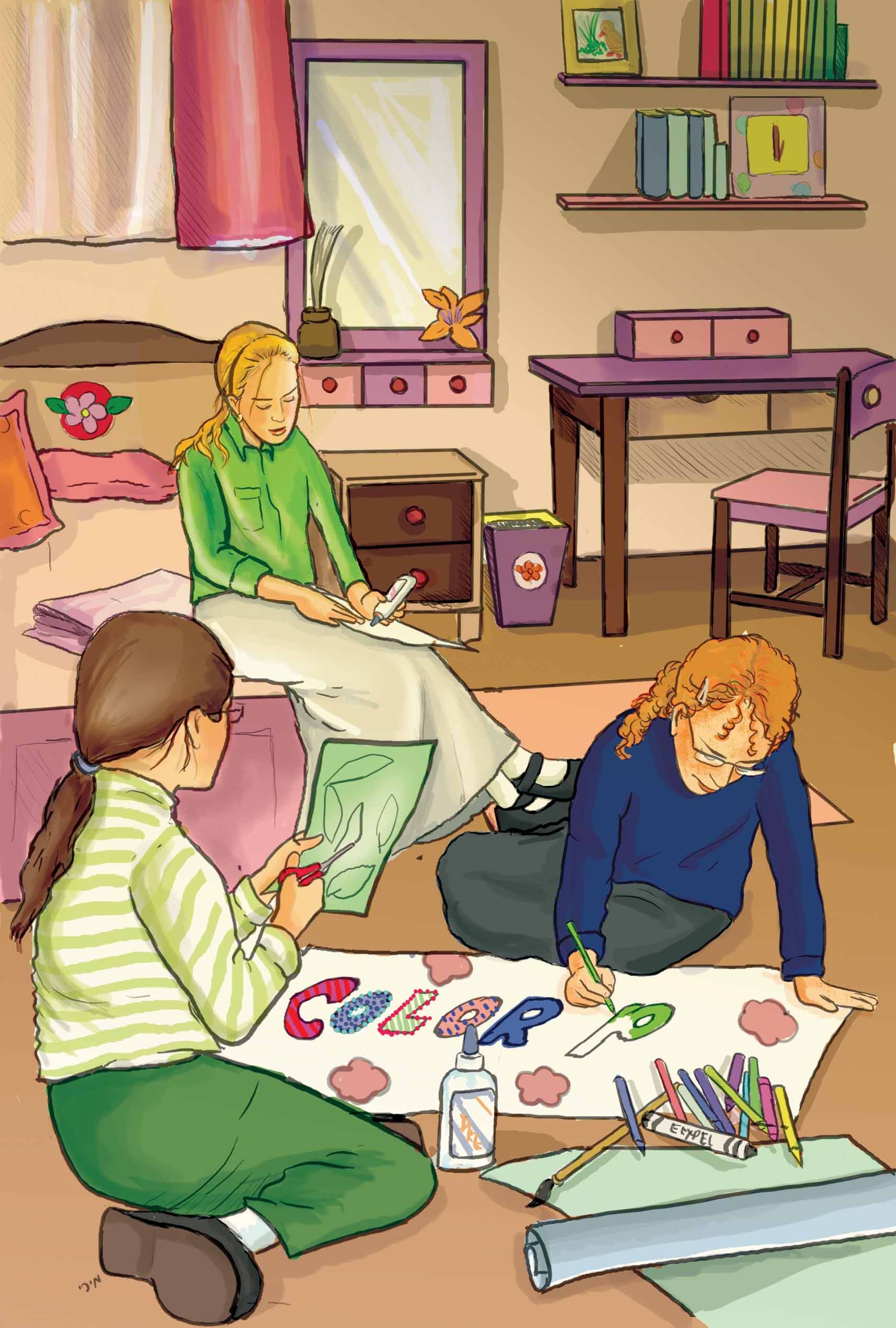 ב. חשוב להדגיש גם את המקומות המוארים, ולא רק את ההצללות - אם לדוגמא, הילדה השמאלית הכי קרובה למקור האור - הפנים שלה אמורים להיות מוארים בחצי השמאלי שלהם - חשוב להוסיף צבע של אור.