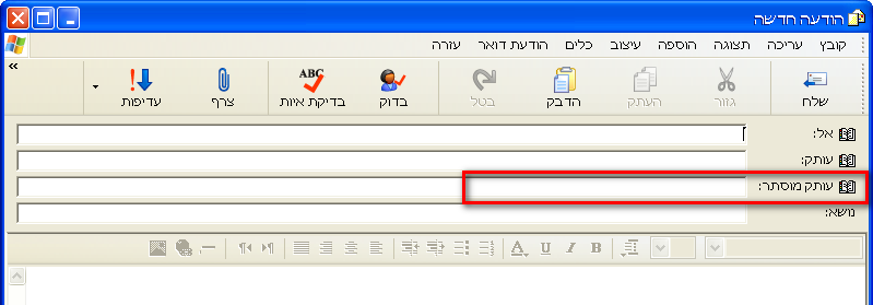 ב'מיקרוסופט אאוטלוק', הכפתור 'עותק מוסתר' הוא מוסתר... אז לוחצים על 'אל' ואז מגיעים לחלון ששם יש למטה עותק מוסתר. אם כתבנו אפילו אות סתמית בשורה של 'עותק מוסתר' אפשר כבר לסגור את החלון ולחזור ואז כבר תופיע השורה של 'עותק מוסתר'.