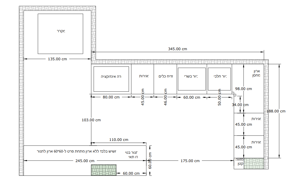 וכך האינדוקציה תשב מעליהם ואת התנור תכננו להתקין מתחת האי, כמו שרואים בשרטוט המצורף.