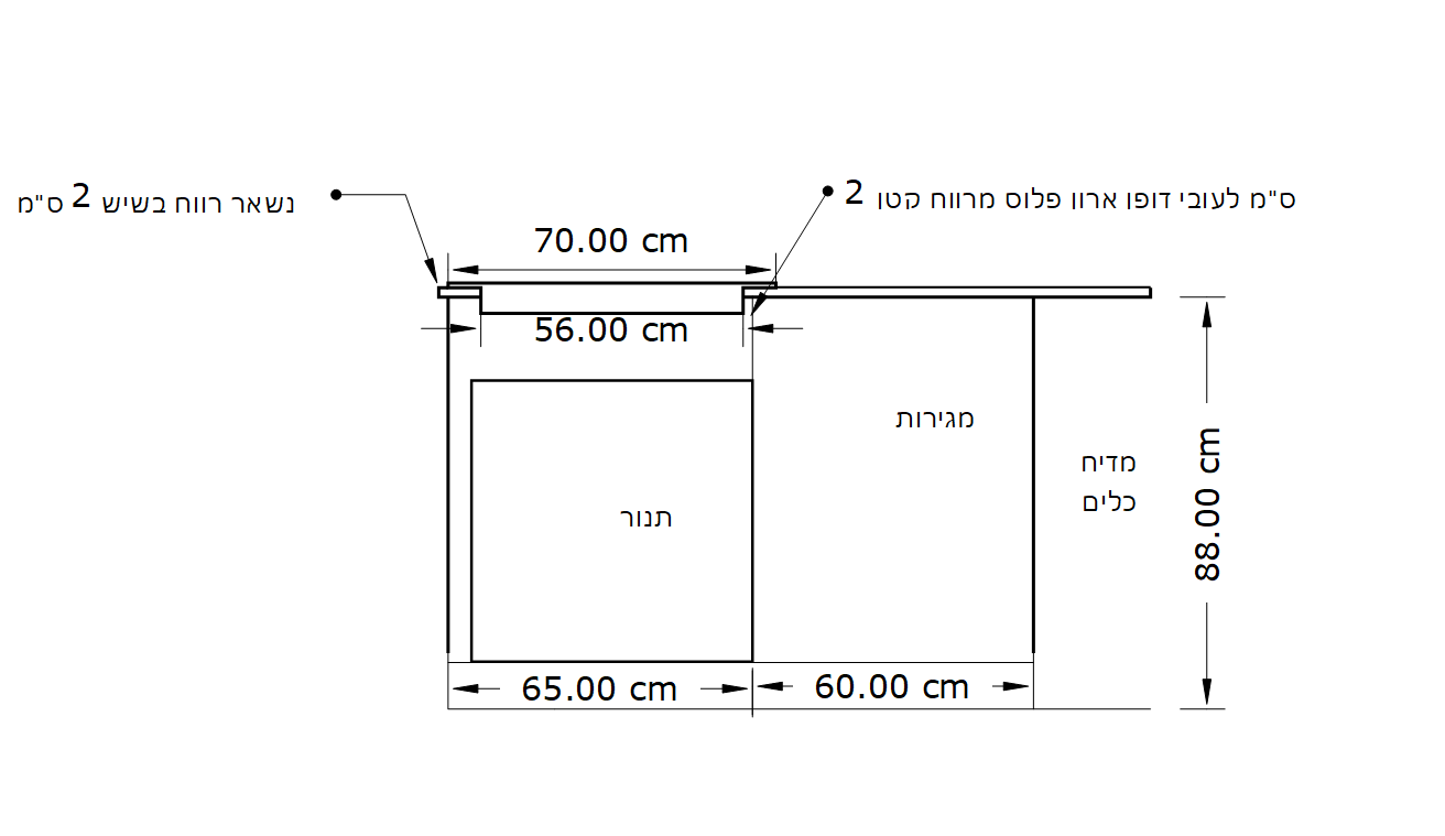 אז חשבנו לעשות ארון ברוחב 65 תחת הכירה ששם יהיה התנור ואת המגירות נגדיל ל60, ואז את הבליטה של הכירה שנכנסת לתוך הארון שרוחבה הוא 56 ס"מ נצמיד לדופן הימנית של הארון שתחתיה, ואז מכיוון שהכירה למעלה רחבה עוד 7 ס"מ לכל צד,