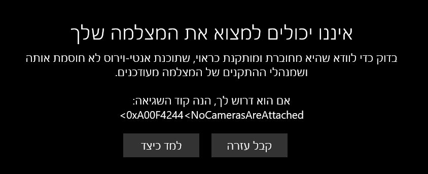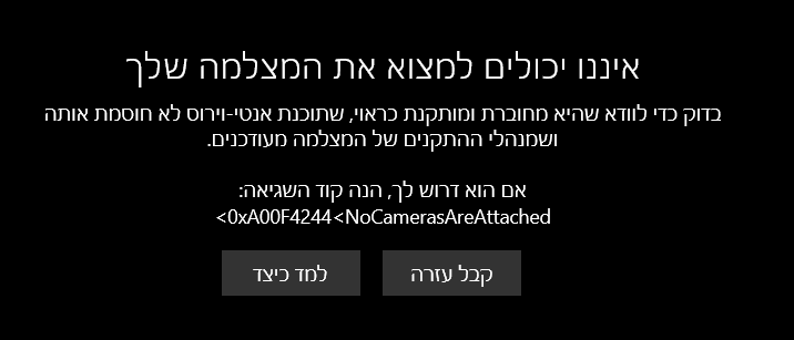 "בדוק כדי לוודא שהיא מחוברת ומותקנת כראוי, שתוכנת אנטי וירוס לא חוסמת אותה, ושמנהלי ההתקנים של המצלמה מעודכנים, אם הוא דרוש לך, הנה קוד השגיאה:......".