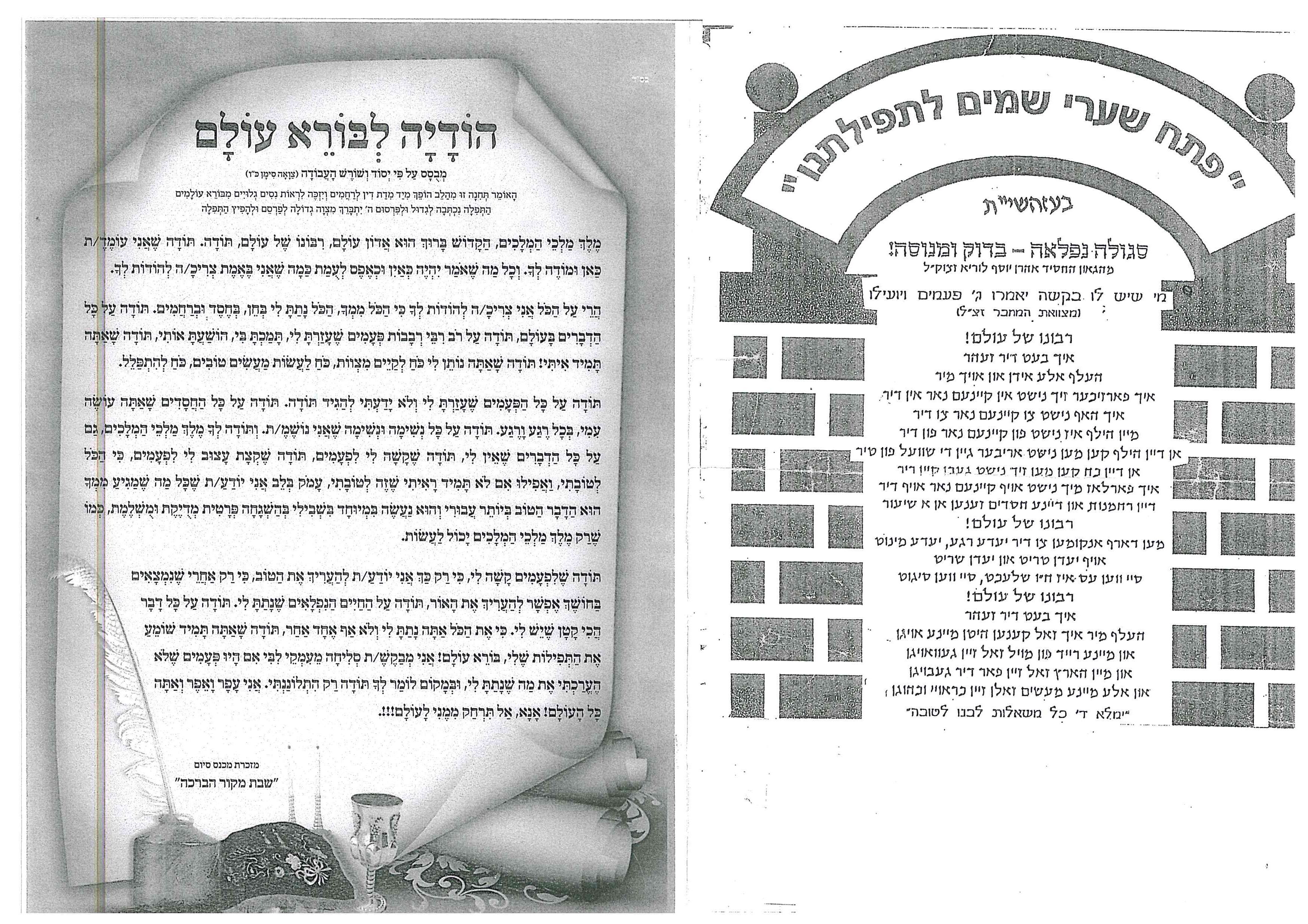 תּוֹדָה שֶׁאֲנִי עוֹמֵד כָּאן וּמוֹדה לְךָ, וְכׂל מַה שֶאׂמַר יִהְיֶה כְאַין וּכְאֶפֶס לְעֻמַת כַּמָּה שֶאֲנִי צָרִיך לְהוֹדוֹת לְךָ, וְהַרֵי עַל הַכֹּל אֲנִי צָרִיך לְהוֹדוֹת לְךָ, כִּי הַכֹּל מִמְּךָ. תּוֹדָה עַל כּׂל הַדְּבָרִים שֶׁבַּעוֹלָם. תּוֹדָה עַל רֳב רִיבֵי רְבָבוֹת פְּעָמִים שֶעָזַרְתָּ לִי, תָּמַכְתָּ בִּי, הוֹשַעְתָּ אוֹתִי, הִצַּלְתָּ אוֹתִי,שִׂמַחְתָּ אוֹתִי, רִפֵּאתָּ אוֹתִי, שָׁמַרְתָּ עָלַי, עוֹדַדְתָּ אוֹתִי... תּוֹדָה שֶׁאַתָּה תָּמִיד אִיתִי. תּוֹדָה שֶׁאַתָּה נוֹתֵן לִי כּׂחַ לַעֲשׂוֹת מִצְווֹת, כֹּחַ לַעֲשׂוֹת מַעֲשִׂים טוׂבִים, כּׂחַ לְהִתְפַּלֵּל. תּוֹדָה עַל כּׂל הַפְּעָמִים שֶׁעָזַרְתָּ לִי וְלׂא יָדַעְתִּי לְהַגִּיד תּוֹדָה. תּוֹדָה עַל הַחֲסָדִים שֶׁאַתָּה עוֹשֶׂה עִמִּי בְְִּכׂל רֶגַע וְרֶגַע. תּוֹדָה עַל כּׂל נְשִׁימָה וּנְשִׁימָה שֶׁאֲנִי נוֹשֵׁם וְתוֹדָה לְךָ מֶלֶךְ מַלְכֵי הַמְּלָכִים גַּם עַל הַדְּבָרִים שֶׁאֵין לִי, תּוֹדָה לְךָ שֶׁקָשֶׁה לִי לִפְעָמִים. תּוֹדָה שֶׁקְּצָת עֲצוּב לִי לִפְעָמִים, כִּי הַכּׂל לְטוֹבָתִי, וְאֲפִילוּ שֶׁלֹא תָּמִיד רָאִיתִי שֶׁזֶה לְטוֹבָתִי עָמׂק בַּלֵּב אֲנִי יוֹדֵעַ שֶּׁהכּׂל מַגִּיעַ מִמְּךָ, הוּא הַדָּבָר הַטּוֹב בְּיוֹתֵר עֲבוּרִי, וְהוּא נַעֲשָׂה בִּמְיֻחָד בִּשְׁבִילִי, בְּהַשְׁגָחָה פְּרָטִית מְדֻיֶּקֶת וּמֻשְׁלֶמֶת, כְּמוֹ שֶׁרַק מֶלֶךְ מַלְכֵי מְלָכִים יָכוֹל לַעֲשׂוֹת. תּוֹדָה שֶׁלִּפְעָמִים קָשֶׁה לִי, כִּי רַק כָּכָה אֲנִי יוֹדֵעַ לְהַעֲרִיךְ אֶת הַטּוֹב, רַק אַחֲרֵי שֶׁנִמְצָאִים בַּחׂשֶׁךְ, אֶפְשָׁר לְהַעֲרִיךְ אֶת הָאוֹר, תּוֹדָה עַל הַחַיִּים הַנִפְלָאִים שֶׁנָּתַתָּ לִי. תּוֹדָה עַל כּׂל דָבָר הֲכִי קָטָן שֶׁיֵּש לִי, כִּי אֶת הַכּׂל אַתָּה נָתַתָּ לִי, וְלֹא אַף אֶחָד אַחֵר. תּוֹדָה שֶׁאַתָּה תָּמִיד שׁוֹמֵעַ אֶת הַתְּפִילוֹת שֶׁלִּי בּוֹרֵא עוֹלָם אֲנִי מְבַקֵש סְלִיחָה מְעִמְקֵי לִבִּי אִם הָיוּ פְּעָמִים שֶׁלֹּא הֶעֱרַכְתִּי אֶת מַה שֶׁנָתַתָּ לִי, וּבִמְקוֹם לוֹמָר לְךָ תּוֹדָה רַק הִתְלוֹנַנְתִּי.