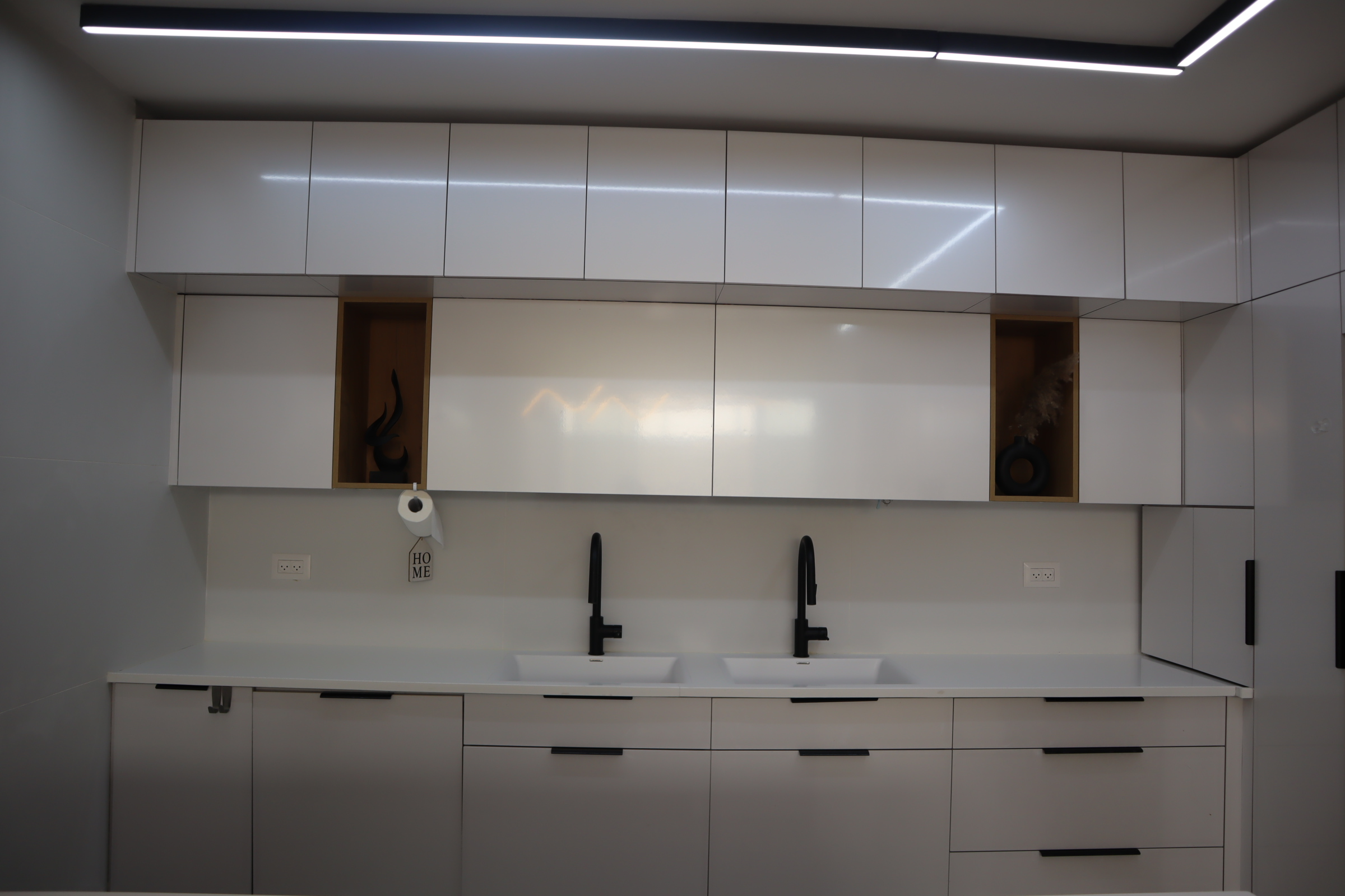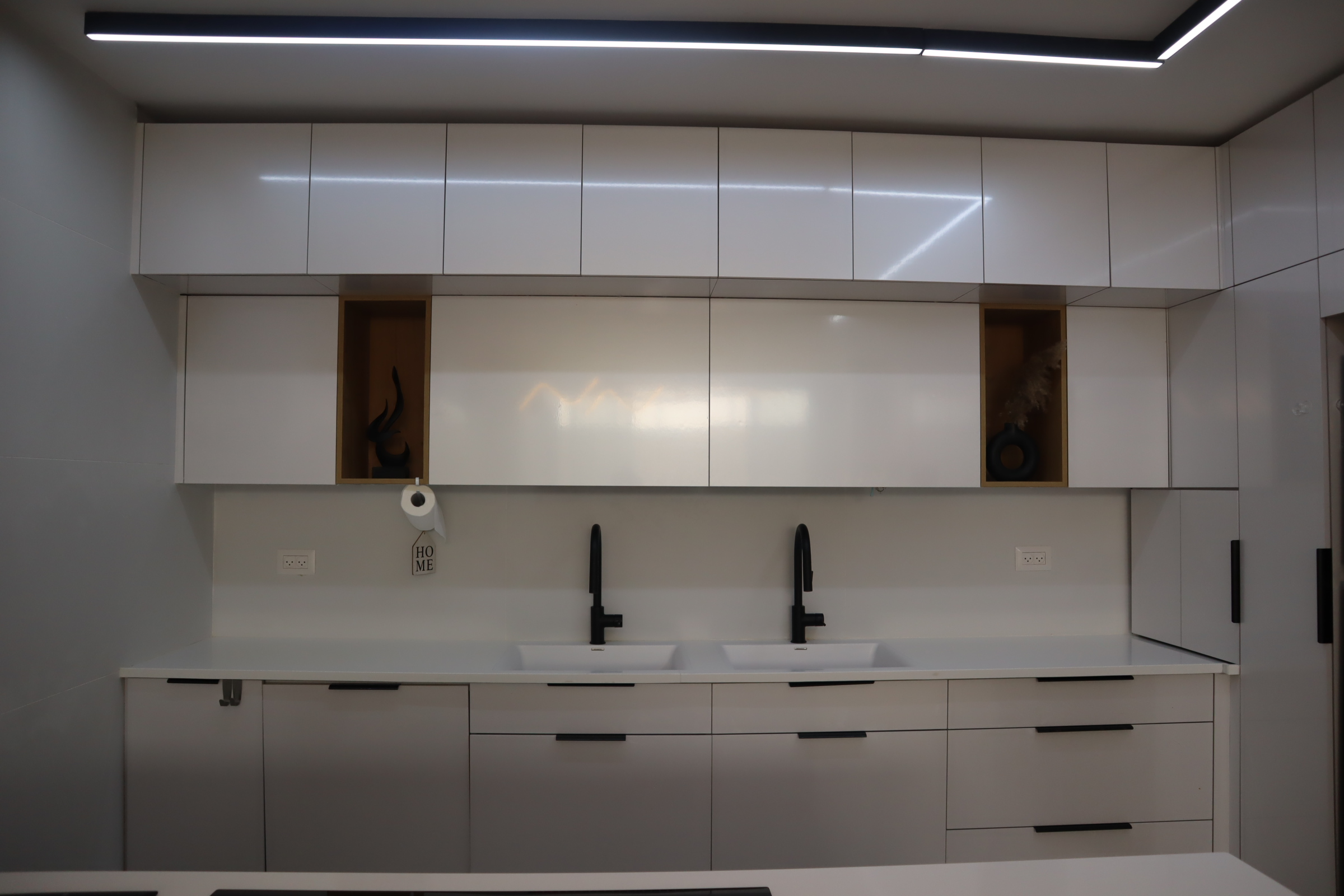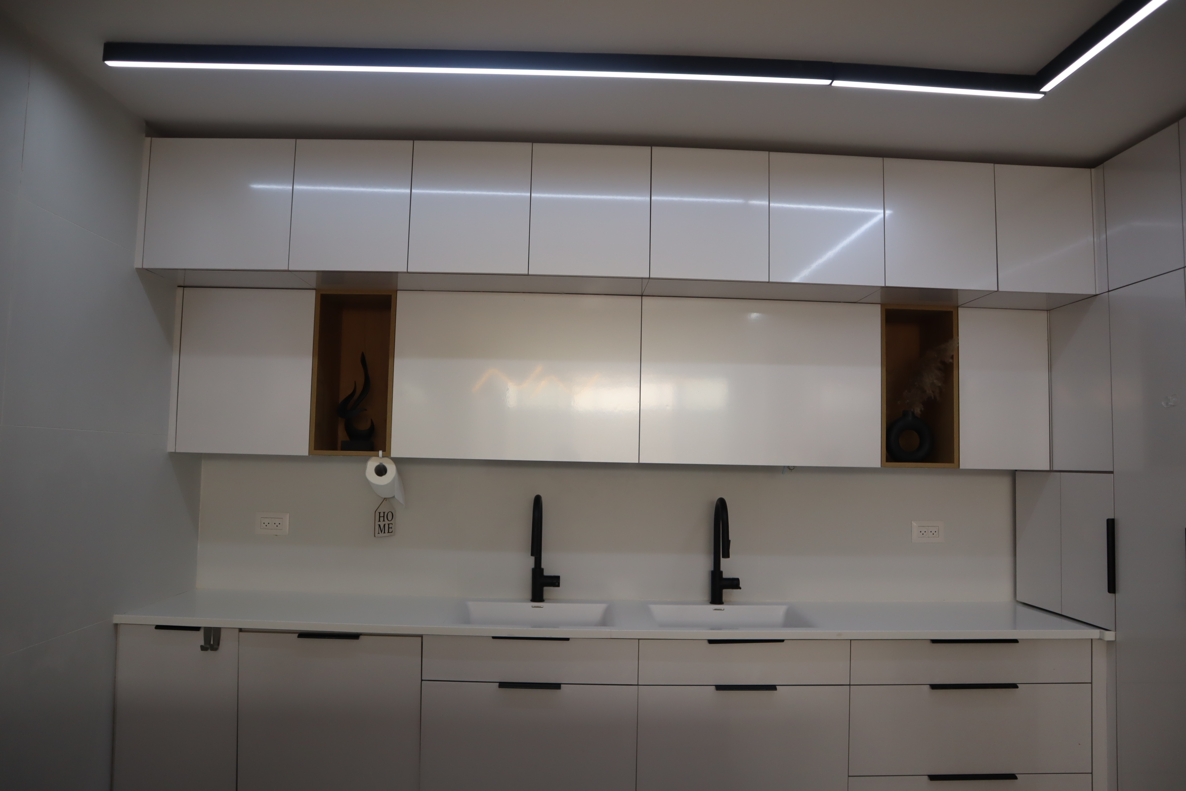 חלק מהארונות - צבע בתנור מחורץ, ידית במה, ויטרינות עם לד, נישה מעוצבת לבר מים, מגירות בלורן לגראבוקס ועוד.