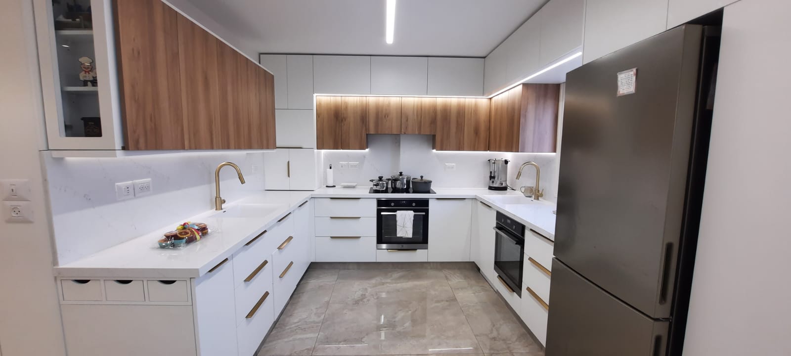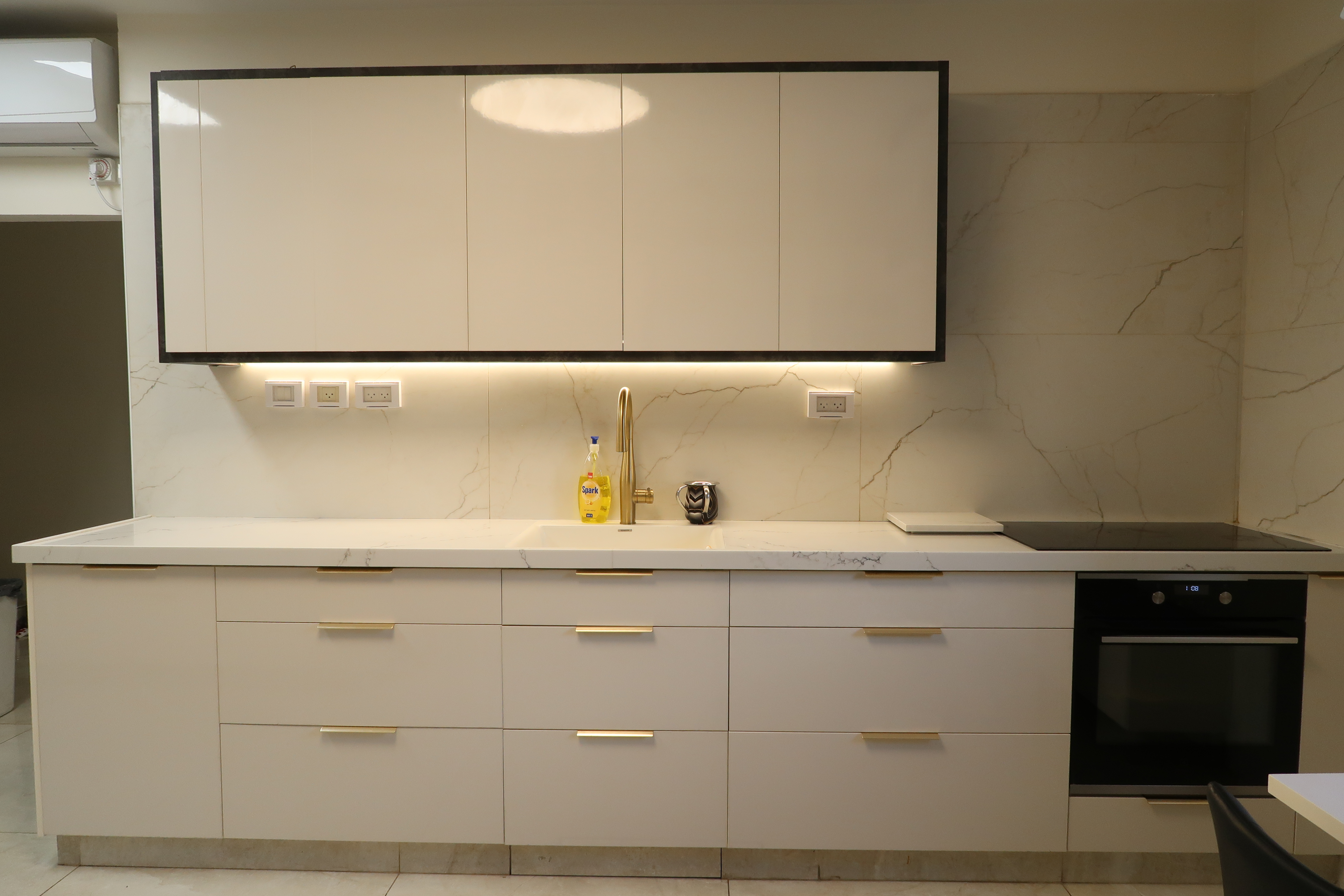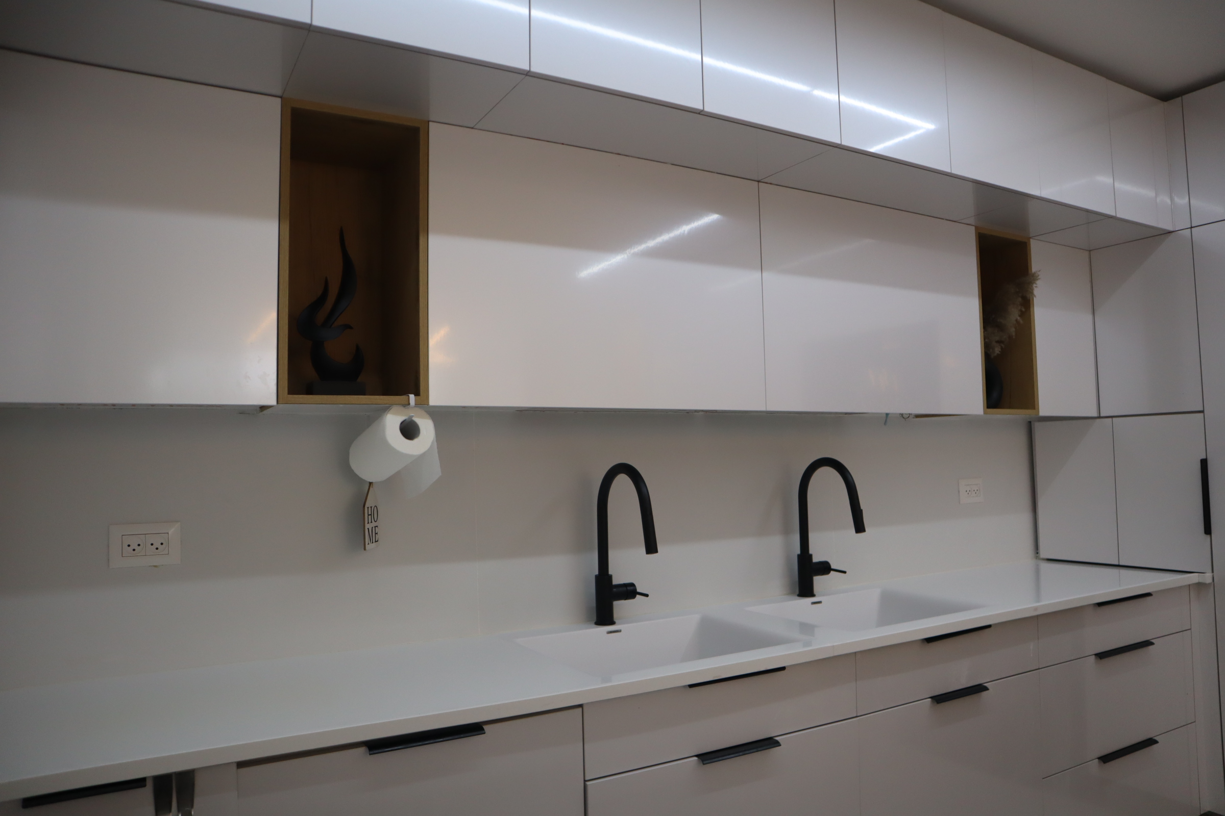 חלק מהארונות - צבע בתנור מחורץ, ידית במה, ויטרינות עם לד, נישה מעוצבת לבר מים, מגירות בלורן לגראבוקס ועוד.