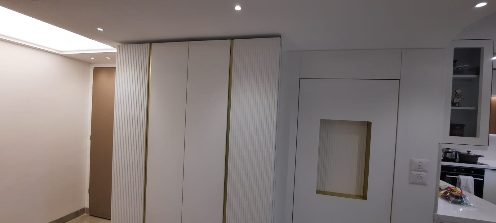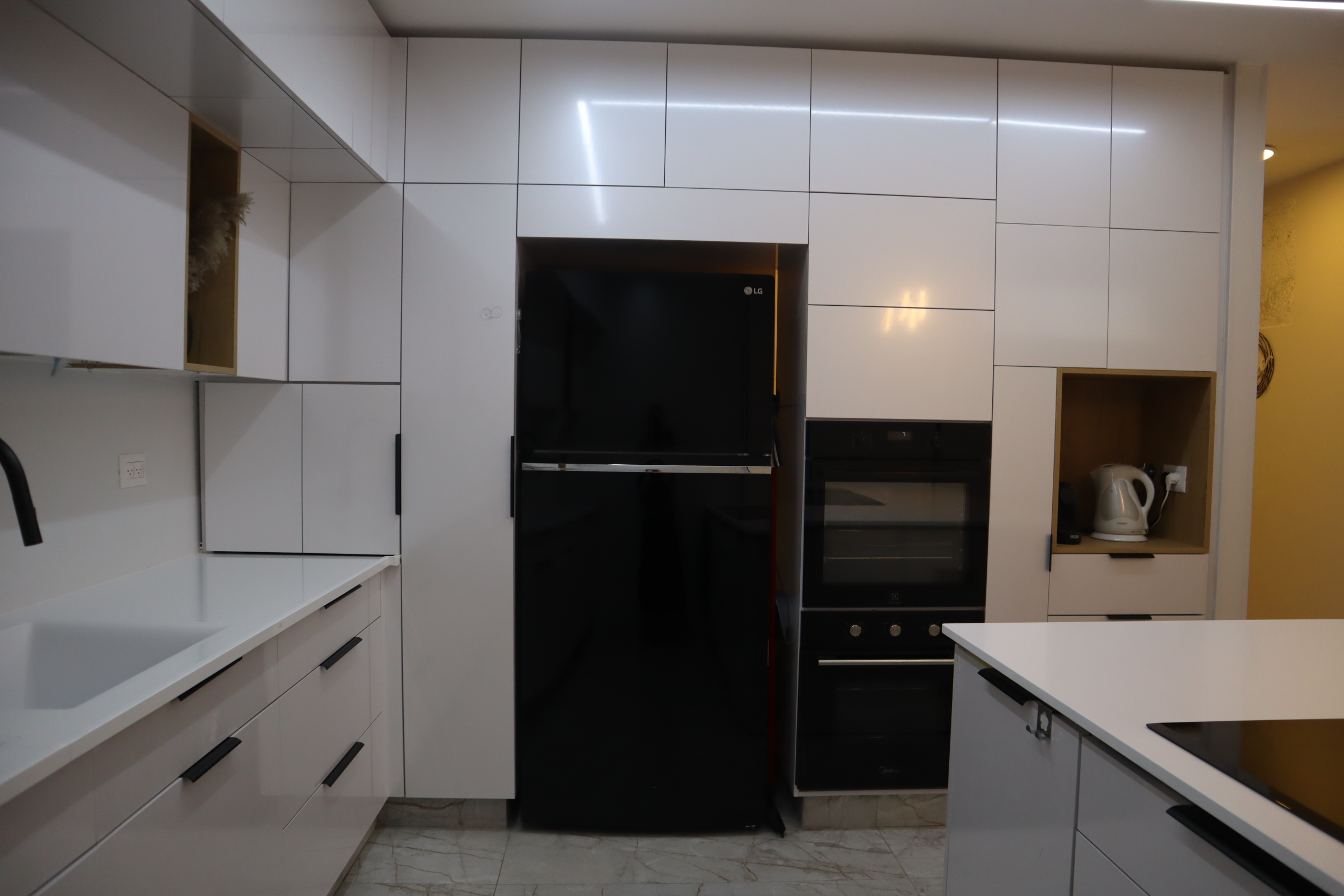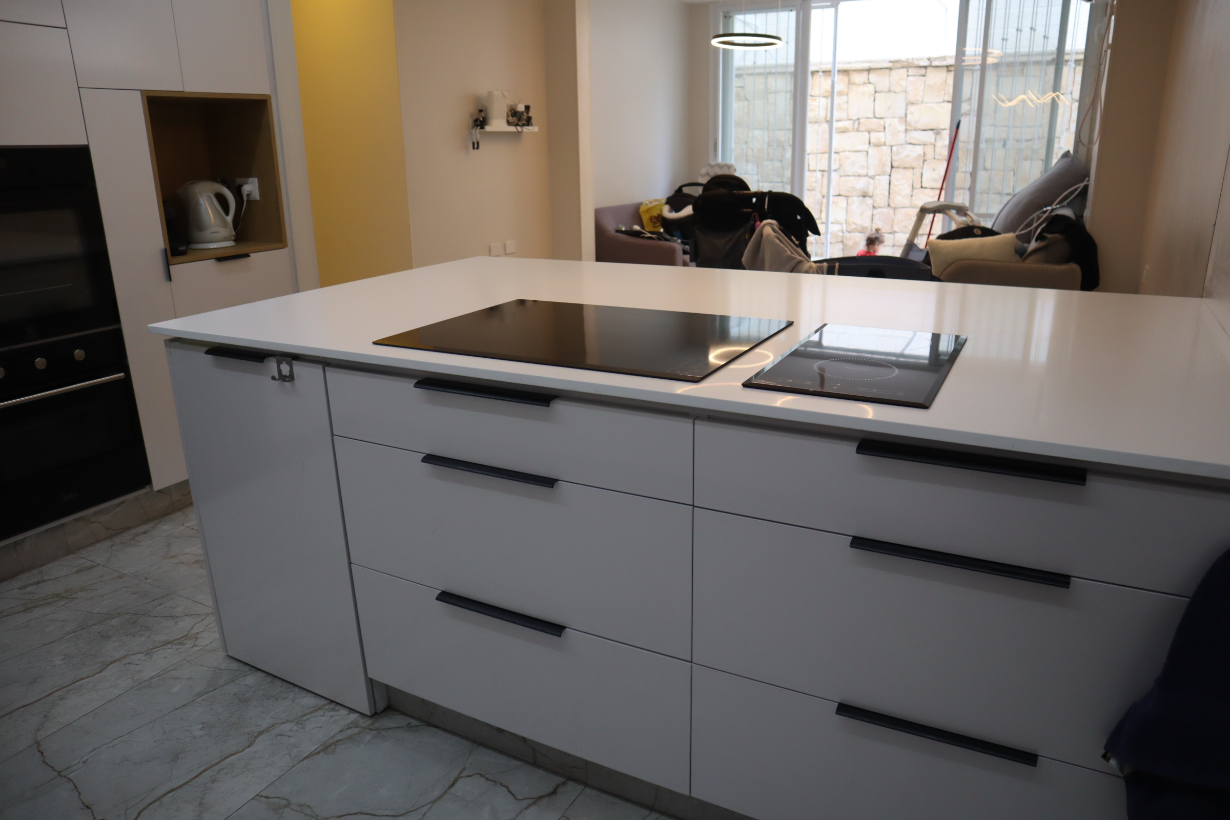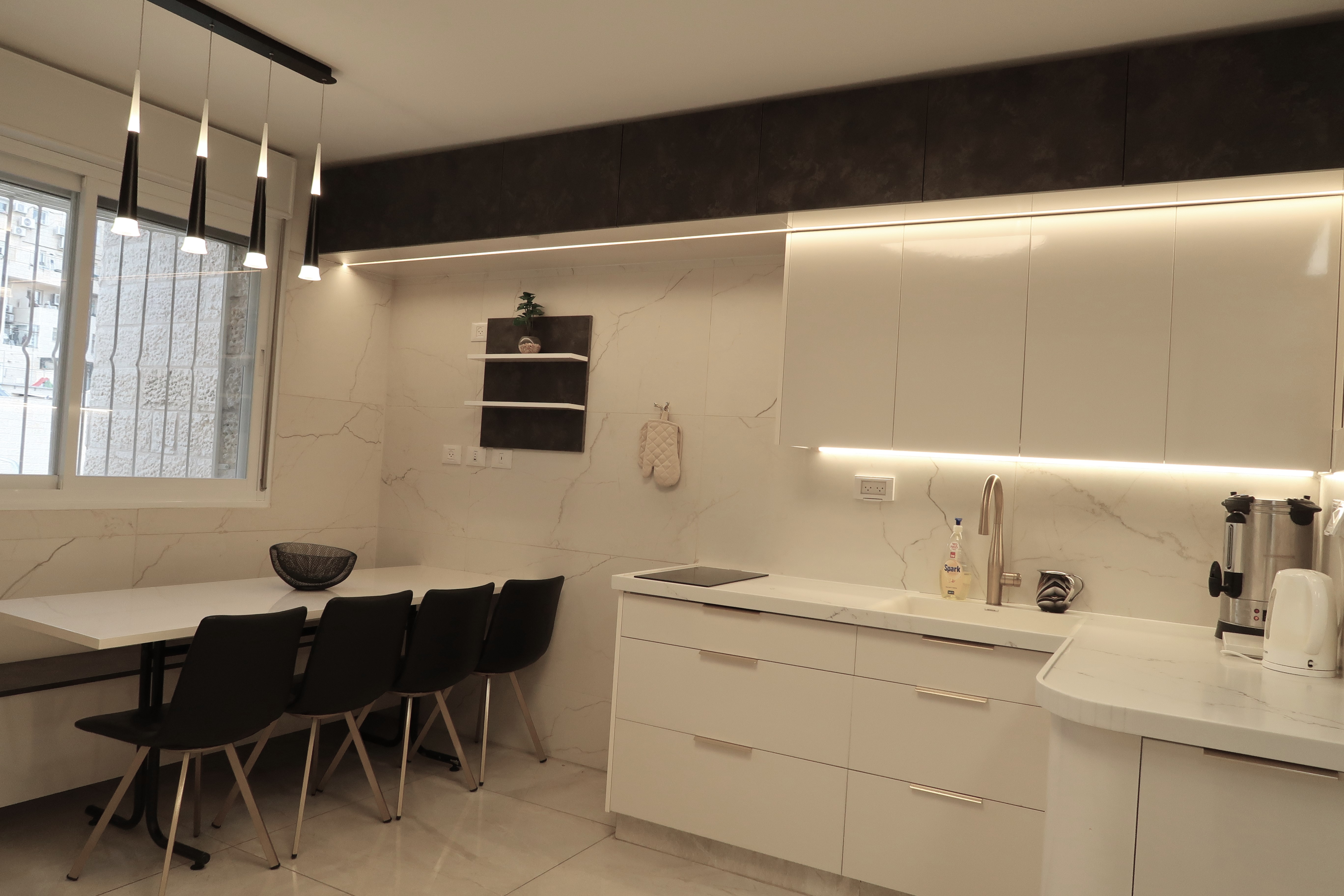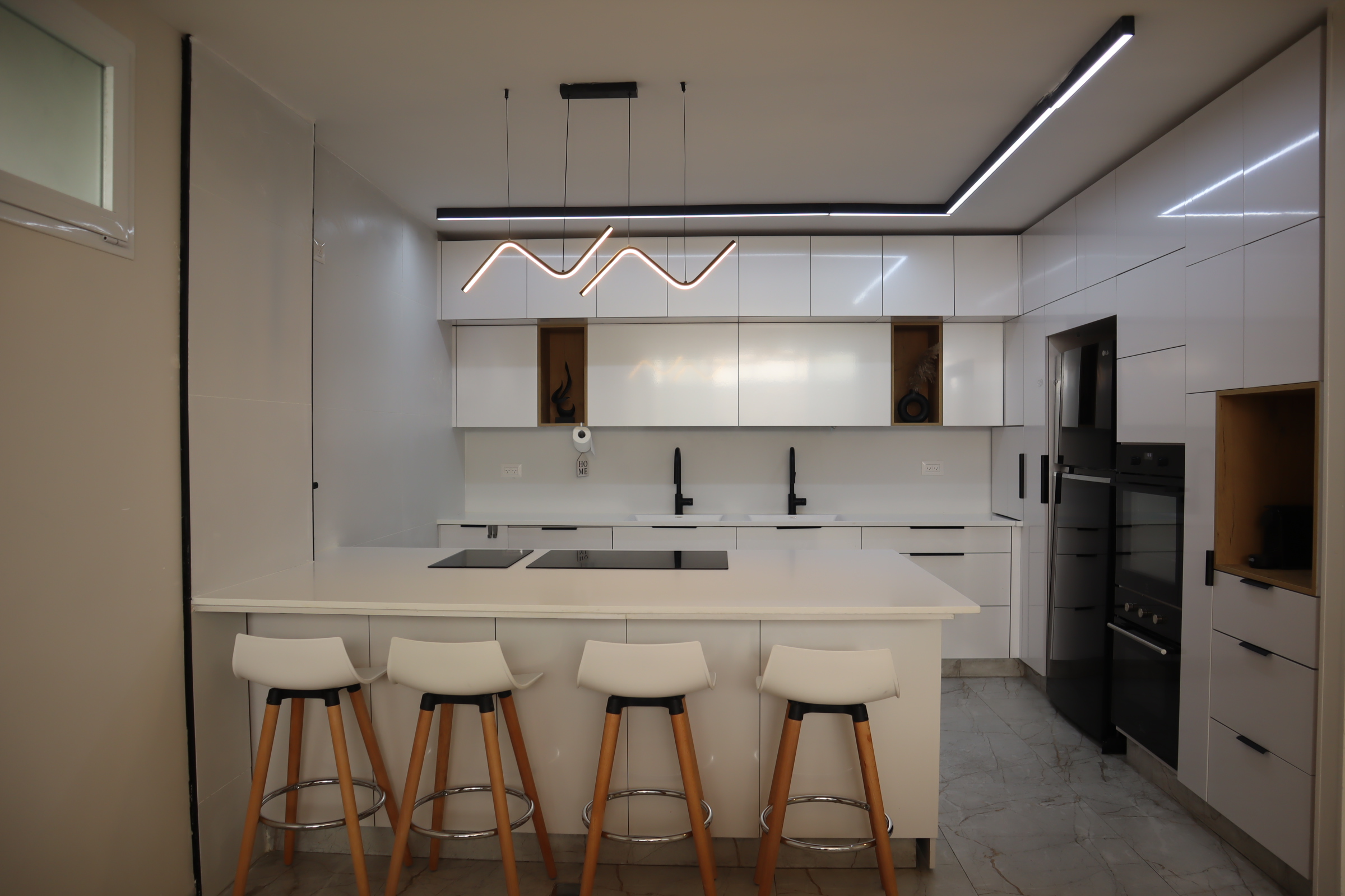 המטבח היה מורכב: כולל מטבח פסח עם סגירה מדהימה, שלא רואים את המטבח, אלא משהו שנותן יופי ורק לפסח נפתח, כניסה מעוצבת מתעגלת שנכנסים, שרואים גם מהסלון, איי מתעגל (לאכול).
