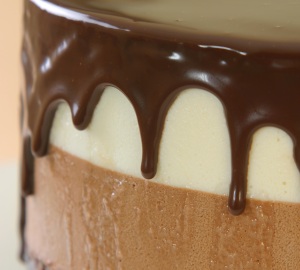 מרתיחים שמנת מתוקה עם מעט מלח. יוצקים על השוקולד המריר ומערבבים עד שהשוקולד נמס. מצננים מעט ויוצקים על העוגה הקפואה. מחזירים למקפיא ל 10 דקות התייצבות, משחררים בזהירות מהתבנית מקלפים את השקף ומעבירים למקרר להפשרה של שעתיים לפני ההגשה.