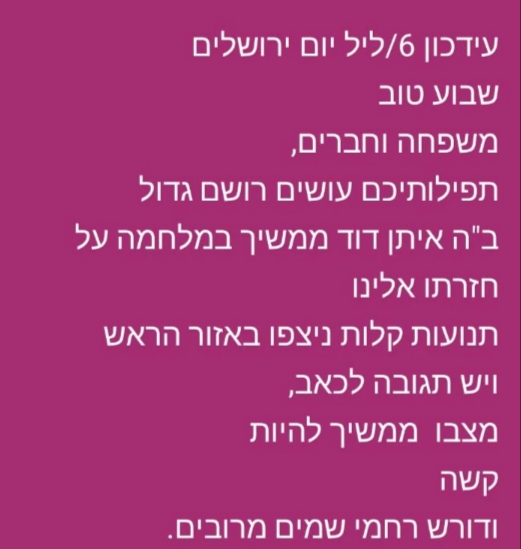 "לפני מספר ימים אתיה חזרה לביתם, ובימים הקרובים תעבור לשיקום. היא מאוד רוצה להתקדם כדי שתוכל לחזור לעצמאות ולהגיע לאיתן דוד. איתן דוד ברוך השם יצא מסכנת חיים, וכרגע הוא מונשם ומורדם במחלקת טיפול נמרץ. אנחנו מתפללים שישוב להכרה ולבריאות מלאה".