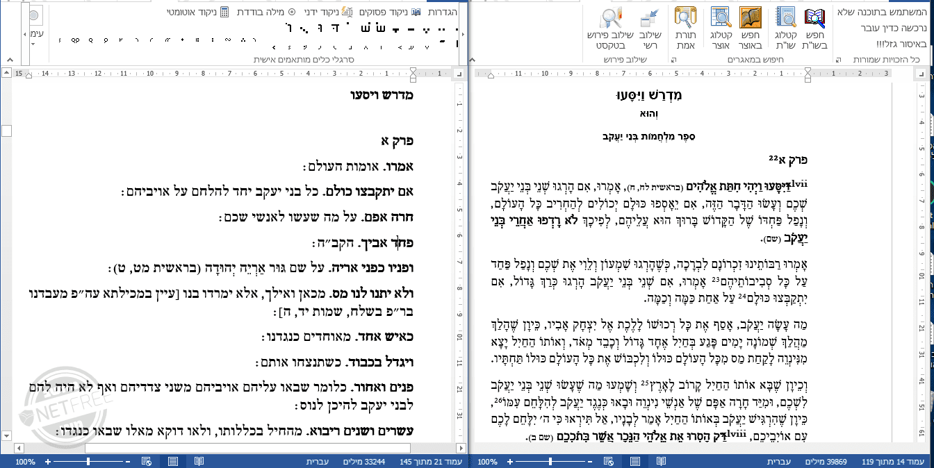 אני מדביק את המדרש בצד הימני ואת הפירוש בצד האמצעי