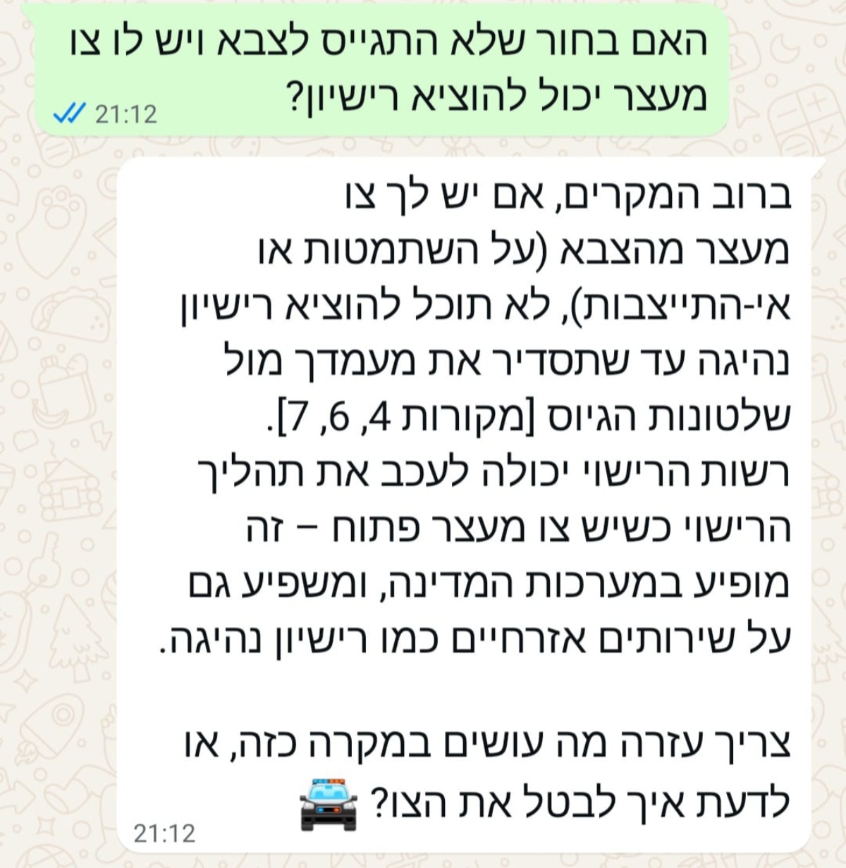 להזכירכם, רשיון אפשר לעשות מגיל 16.9 ועריקים אפשר להיות מסביבות 18. לעולם הם לא יוכלו למנוע מבן אדם לעשות רשיון מבחינה טכנית, לפסול רשיון לאחר שבן אדם עשה, זה מופרך. רשיון זה אישור שאתה יודע לנהוג.